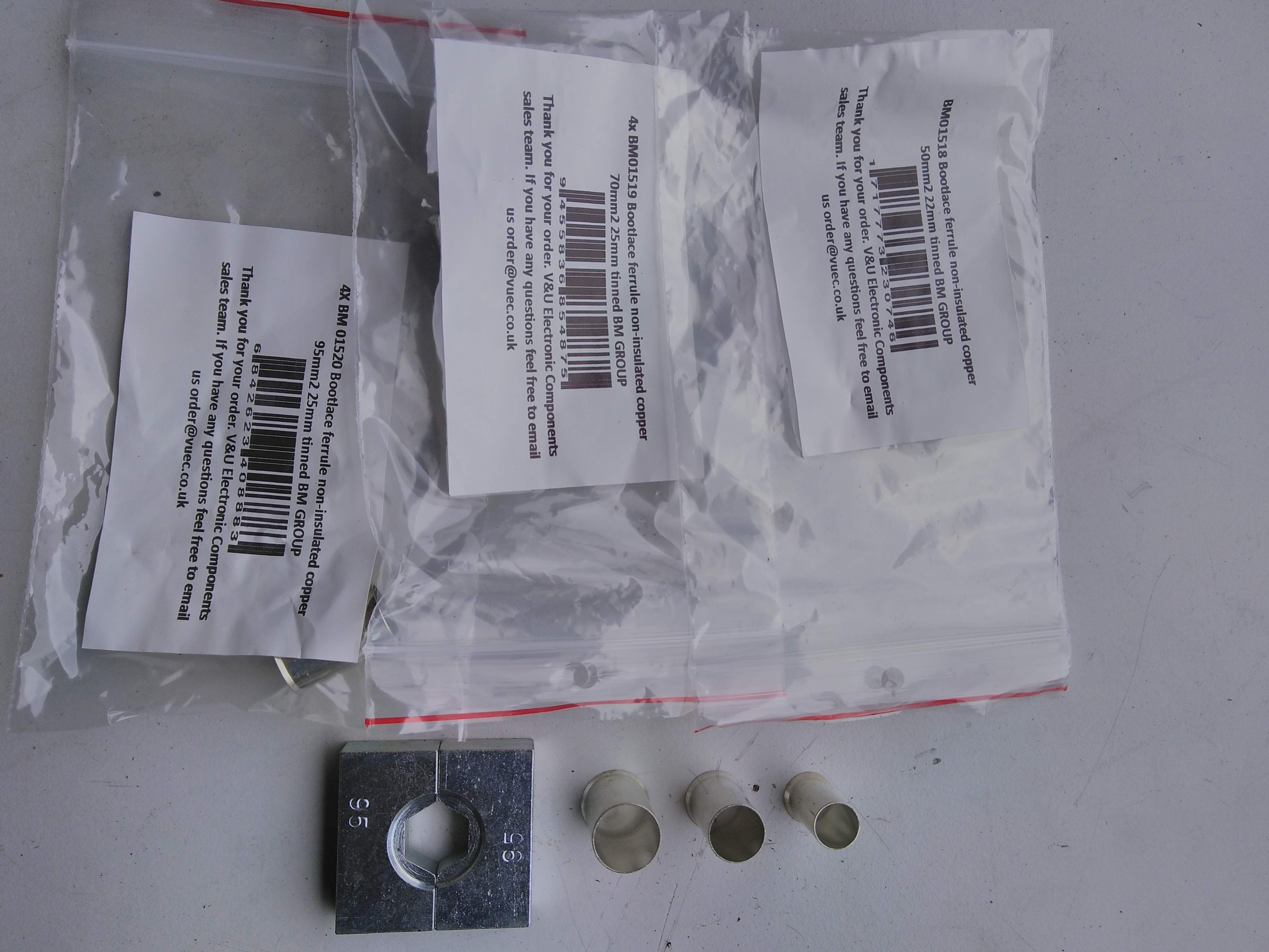 For the 35mm2 SDU cables I used three ferrels which had the screen braid sandwiched between them. This sandwich was gently crimped with a 95mm2 die (being careful not to damage the insulation of the central HV cable) and then heat shrink was applied to both ends to make the assembly look neat. The end result makes a good electrical connection to the screen and fits nicely in the Tesla HVJB.