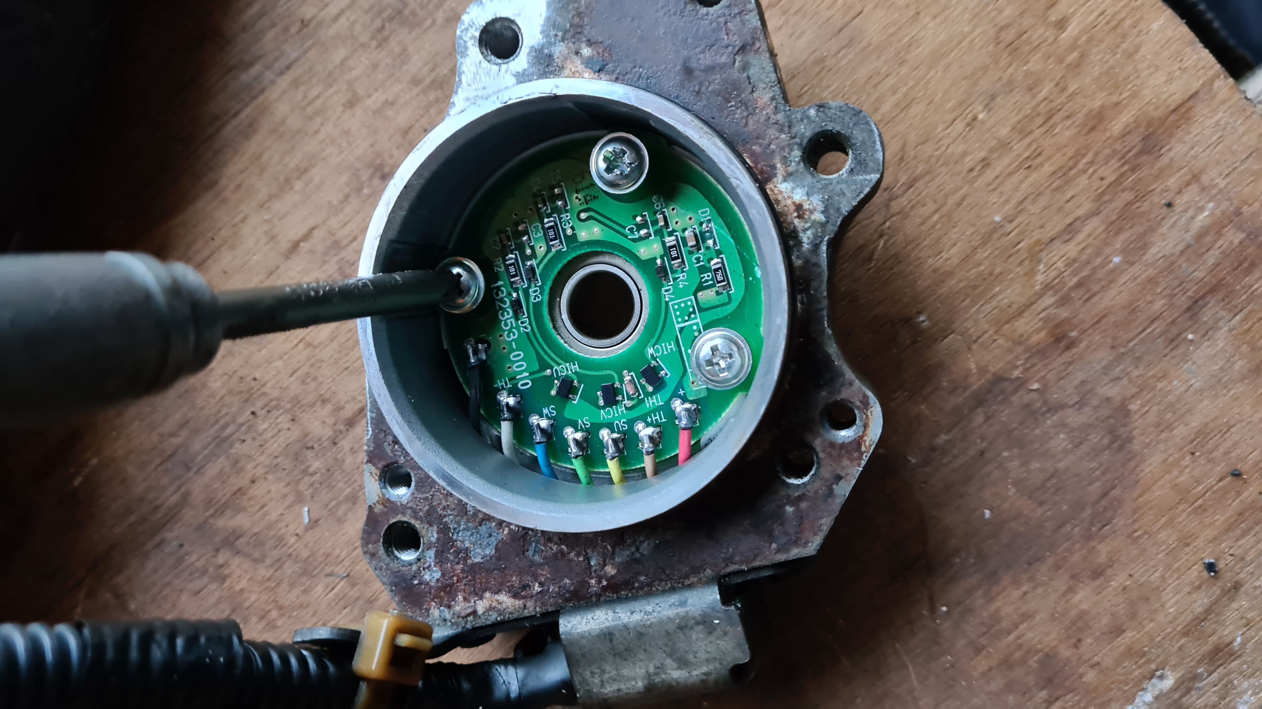 It has been a swine so far. Hope the other jobs on this conversion aren't as tiresome! (I enjoyed it really) The four bolts (10mm hex) came out no problem... but the three cross head screws were totally seized and I manage to strip them. Oops Out came my now indispensable induction heater and plenty of WD40... ...still no joy so I resorted to cold chisel (making a little notch first and then angling the chisel blows to eventually turn them enough to use a "damaged screw remover" bit. Bingo!