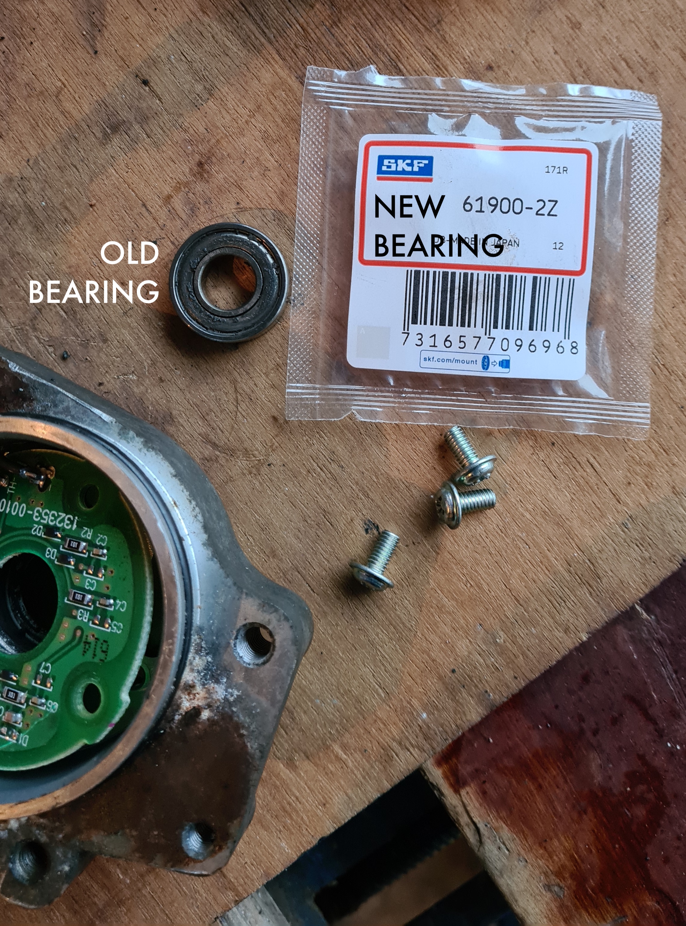 And checked the new bearing was correct (according to the wiki, two different bearings need to be replaced). It seems like the one under the circuit board is the 61900-2Z.