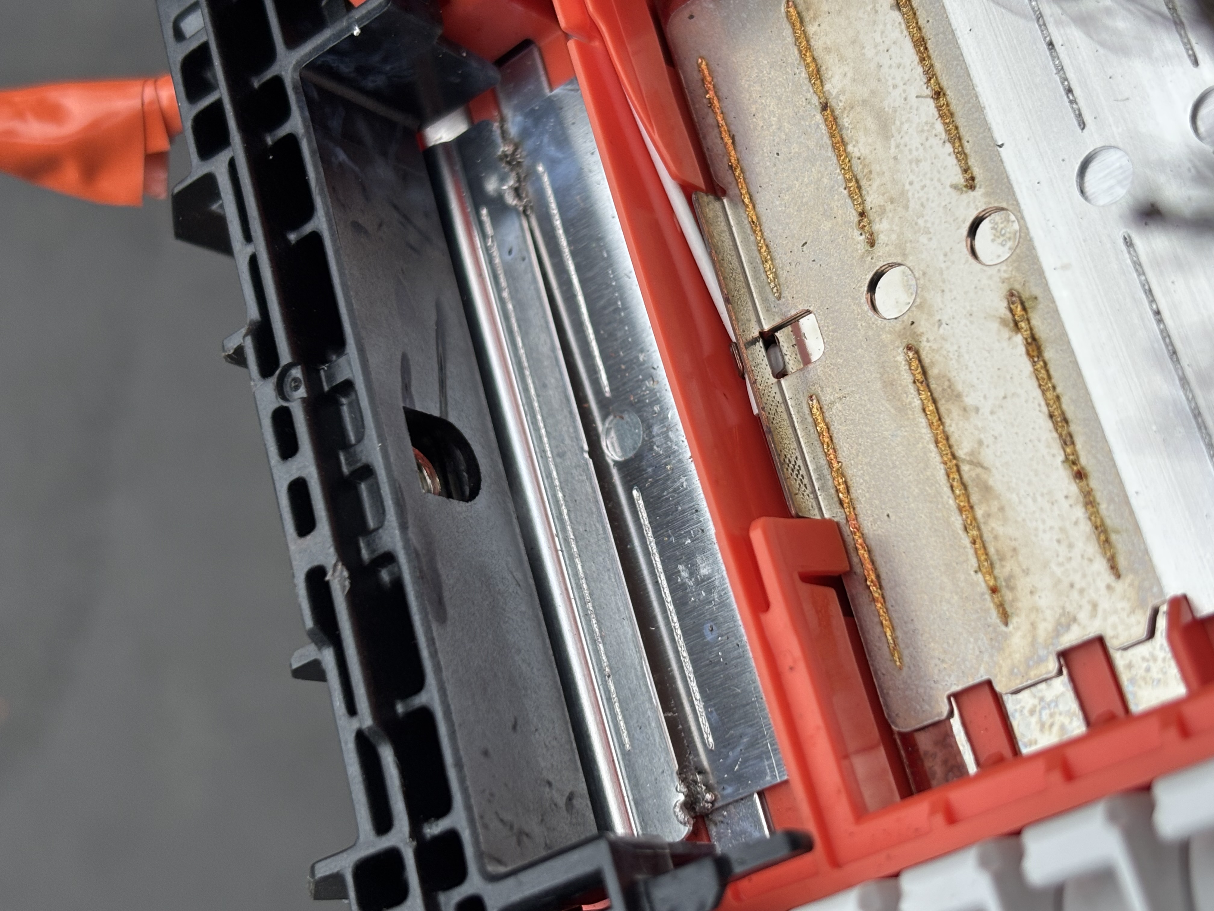 When trying to remove the black plastic piece at the top of the upper image, I noticed something. The left terminal is clipped onto the black plastic piece, and when I pulled the plastic away from the module, the area where the terminal was welded onto the cell stack pulled off.