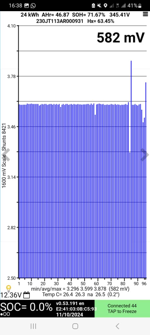 I've successfully connected the BMS, and it shows all 96 cells, with the three temperature sensors working. However, I noticed that in all the YouTube videos I've watched, Leaf Spy displays red and blue lines for the cells, but mine only shows blue. Is the BMS functioning correctly, or am I missing something?