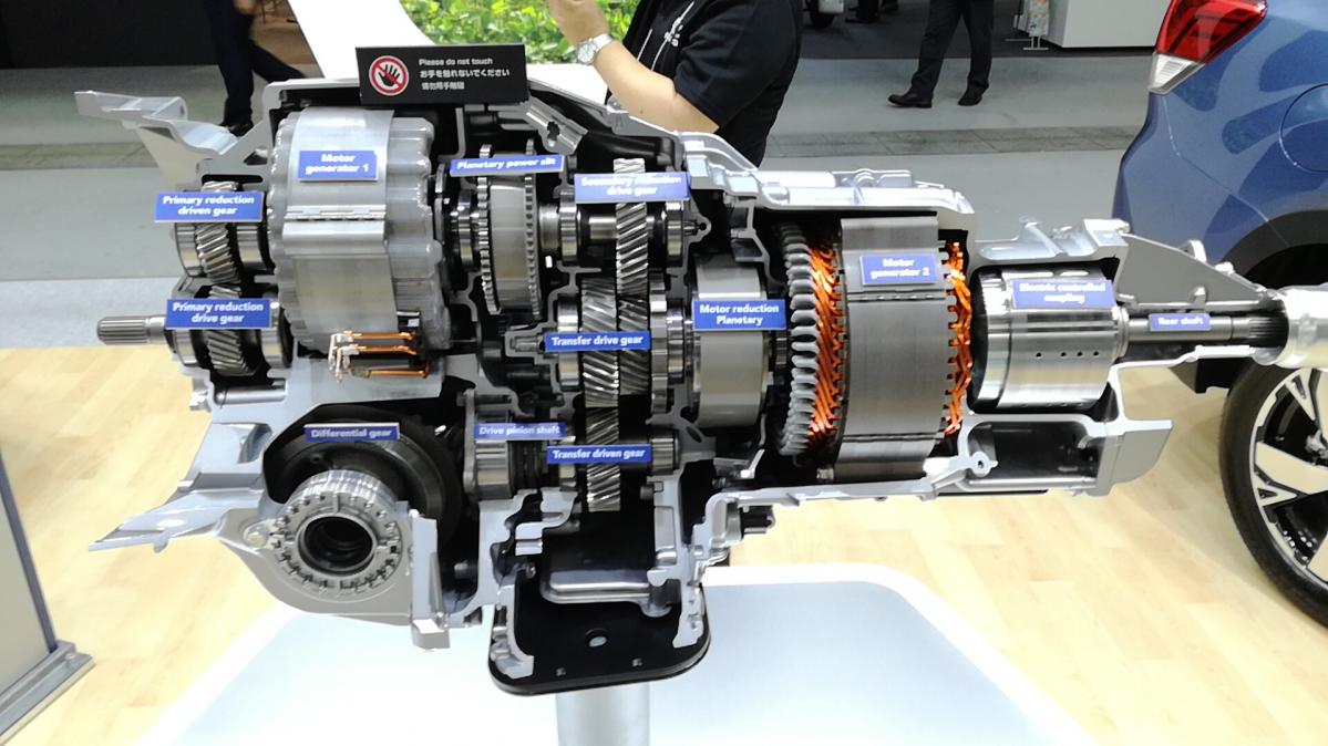 - MG1 with power split device and MG2 with output reduction are on parallel shafts, connected with 0.781:1 gear ratio (effective MG1 to output ratio of 2.8116? aka MG1 to wheel reduction of ~10.403:1? ~416lbft to the wheels based on 40lbft rating)