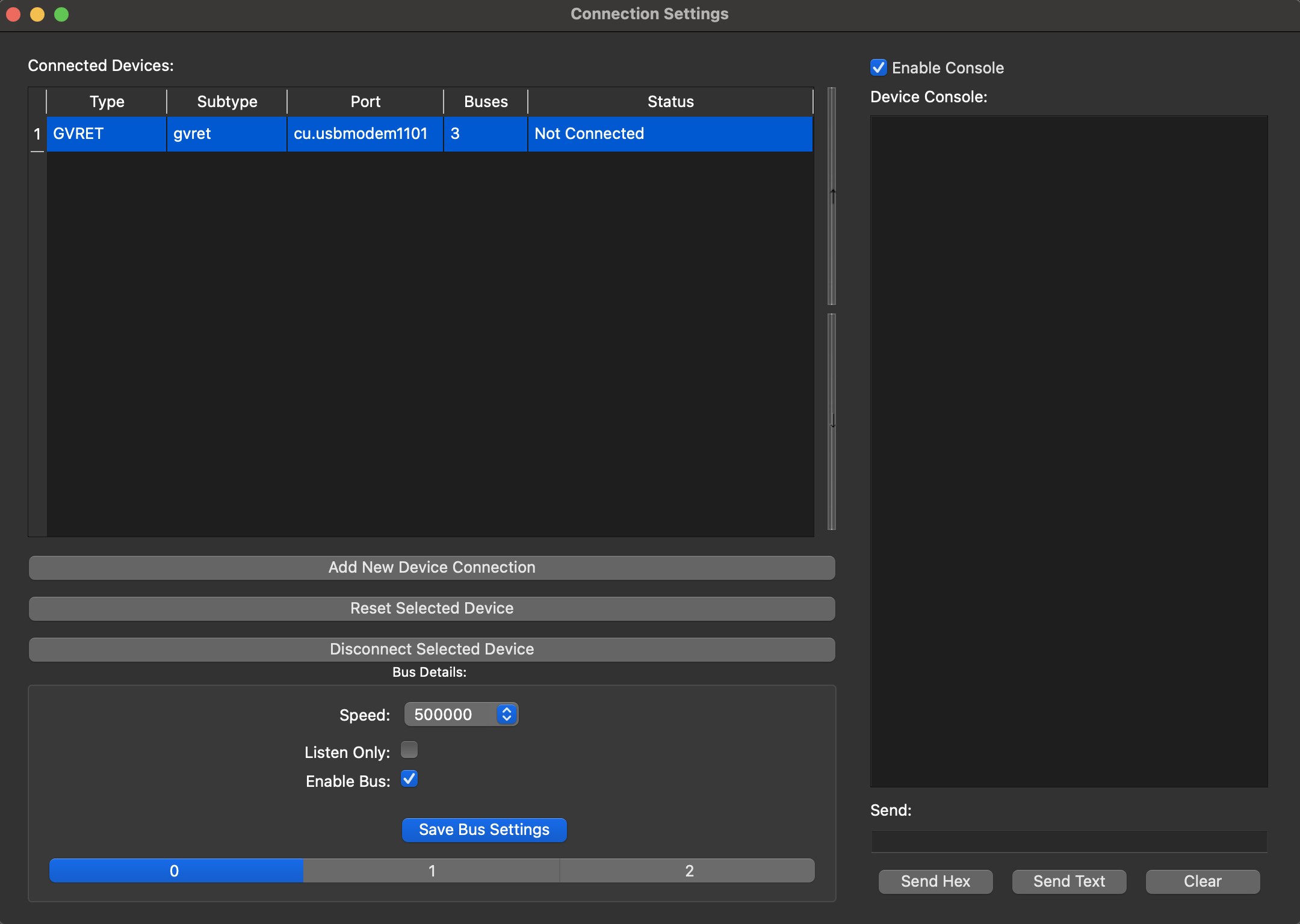 I followed the directions on the OpenInverter Wiki page for CAN bus with Arduino Due (https://openinverter.org/wiki/CAN_bus_with_Arduino_Due) and have reached the final step of closing the Arduino IDE and adding the connection in SavvyCAN. However, SavvyCAN cannot recognize my GVRET-loaded Arduino Due. Interestingly, I am able to connect to the LAWICEL version. First, here is the screenshot of my GVRET (showing not connected):