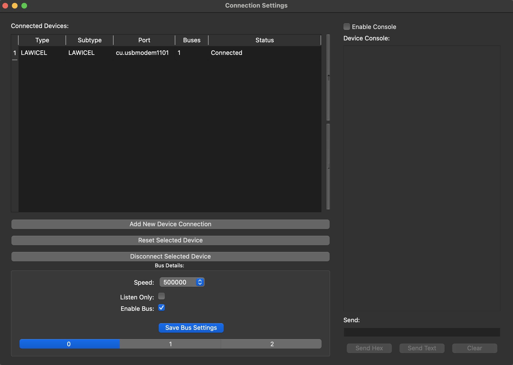 To get the LAWICEL to connect, though, I have to close and reopen SavvyCAN. This doesn't work with the GVRET serial connection. I should also note that SavvyCAN at least detects that the Arduino Due is connected to the USB port, as it shows up on both the Serial GVRET and Serial LAWICEL menus.