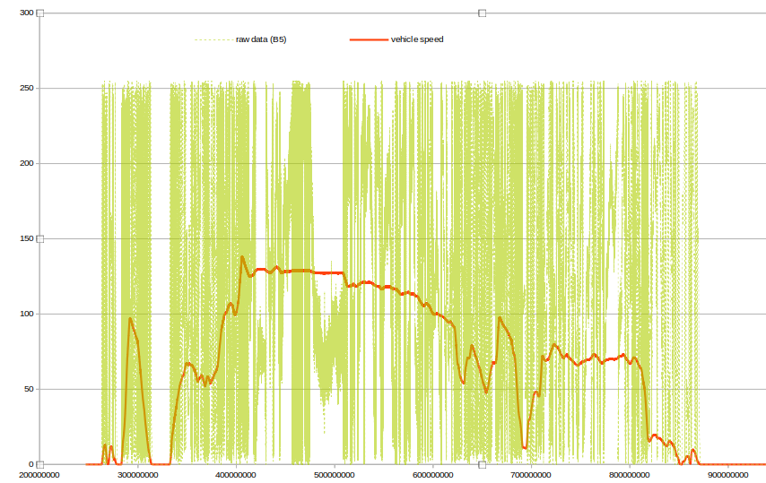 The ESP V Signal is noted in "KiloMeterPerHour" so thats likely my speed, starts at byte 5 (bit 32) and is 16 bits long if I am interpreting the DBC correctly...
