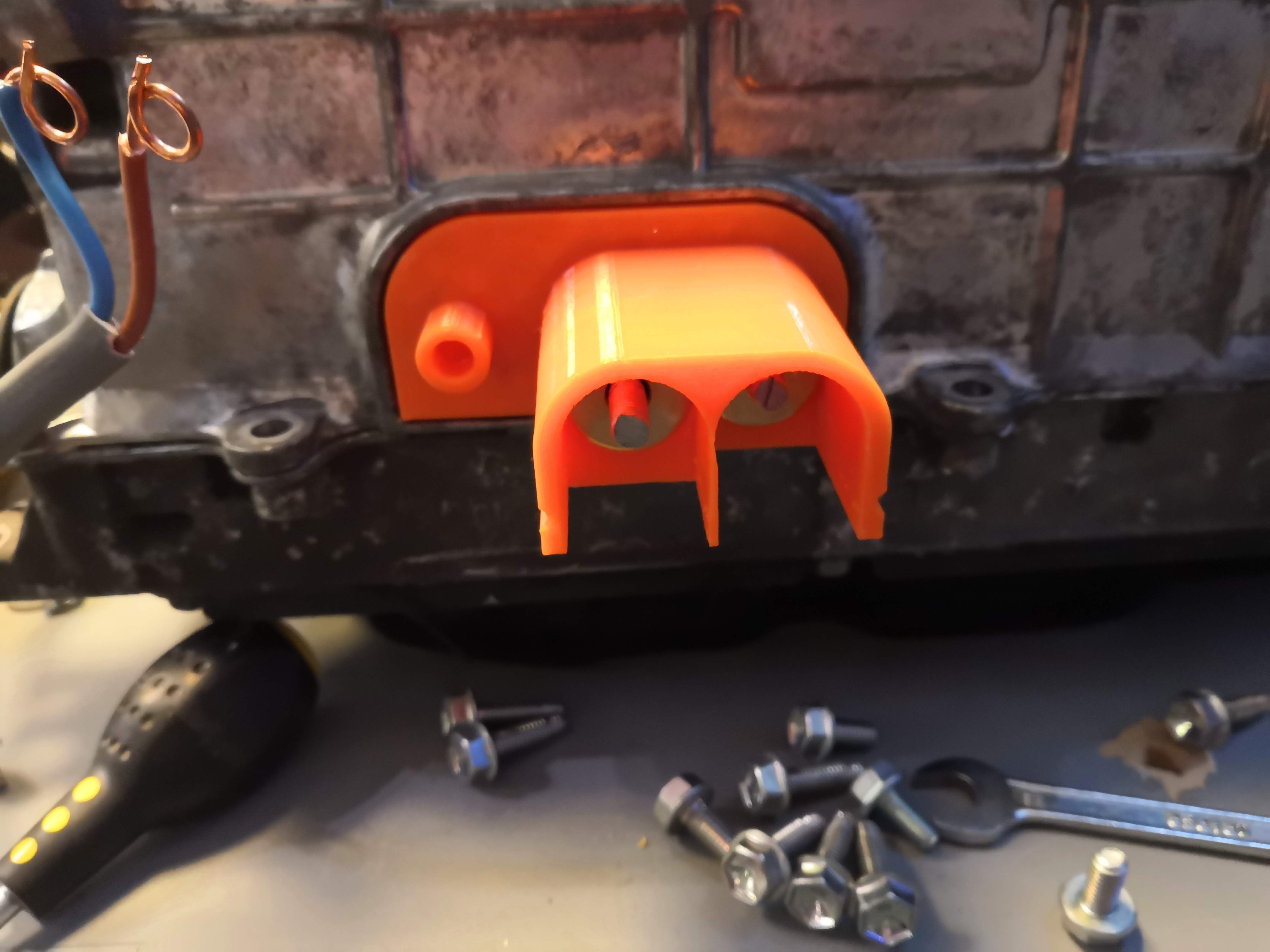 Right, the complicated one. This is my first pass at a 3D printed part(s) to house and seal in the battery connectors in the new location, using Damien's machined brass standoffs. It's not perfect yet but prints and fits together nicely.