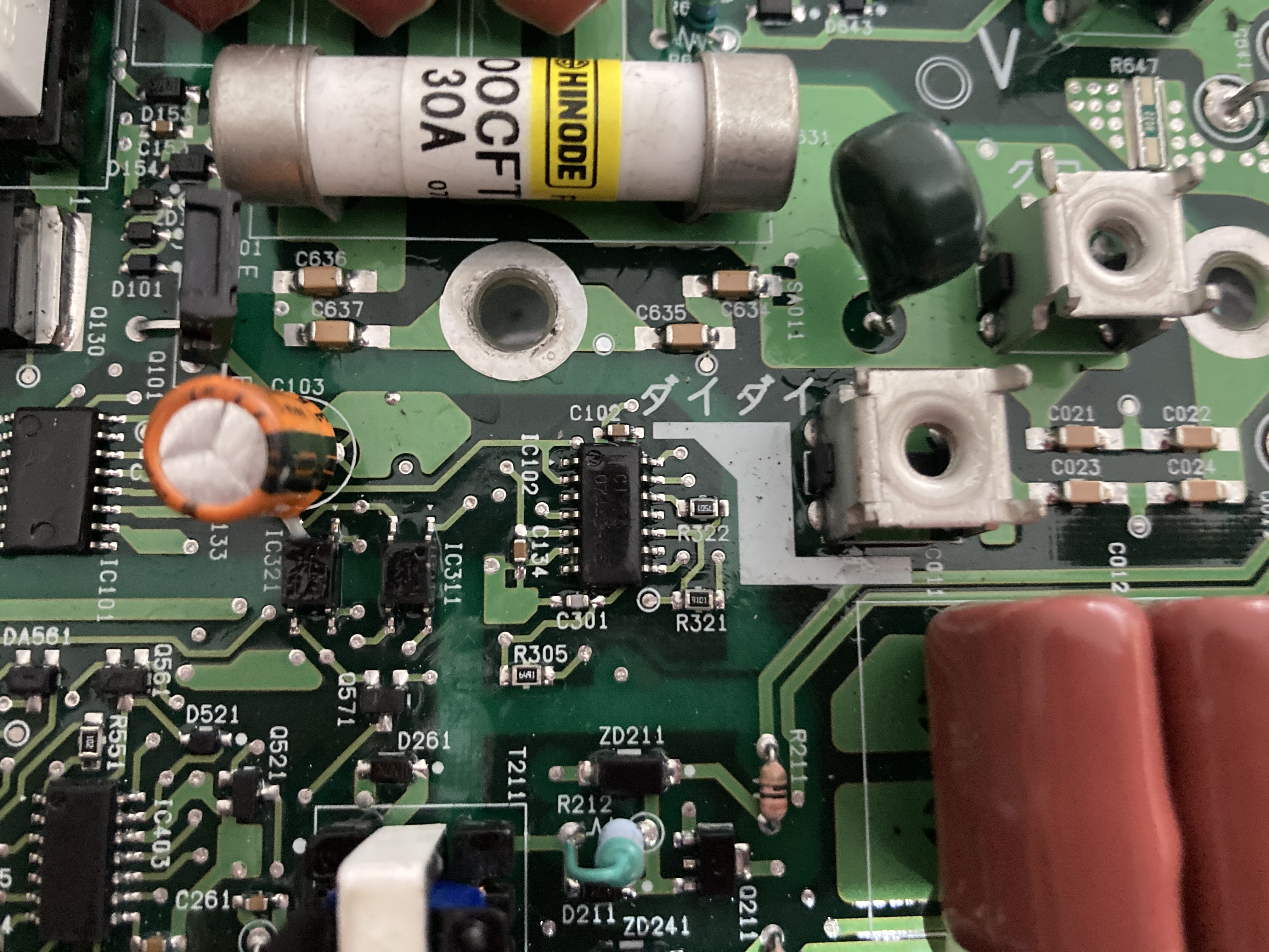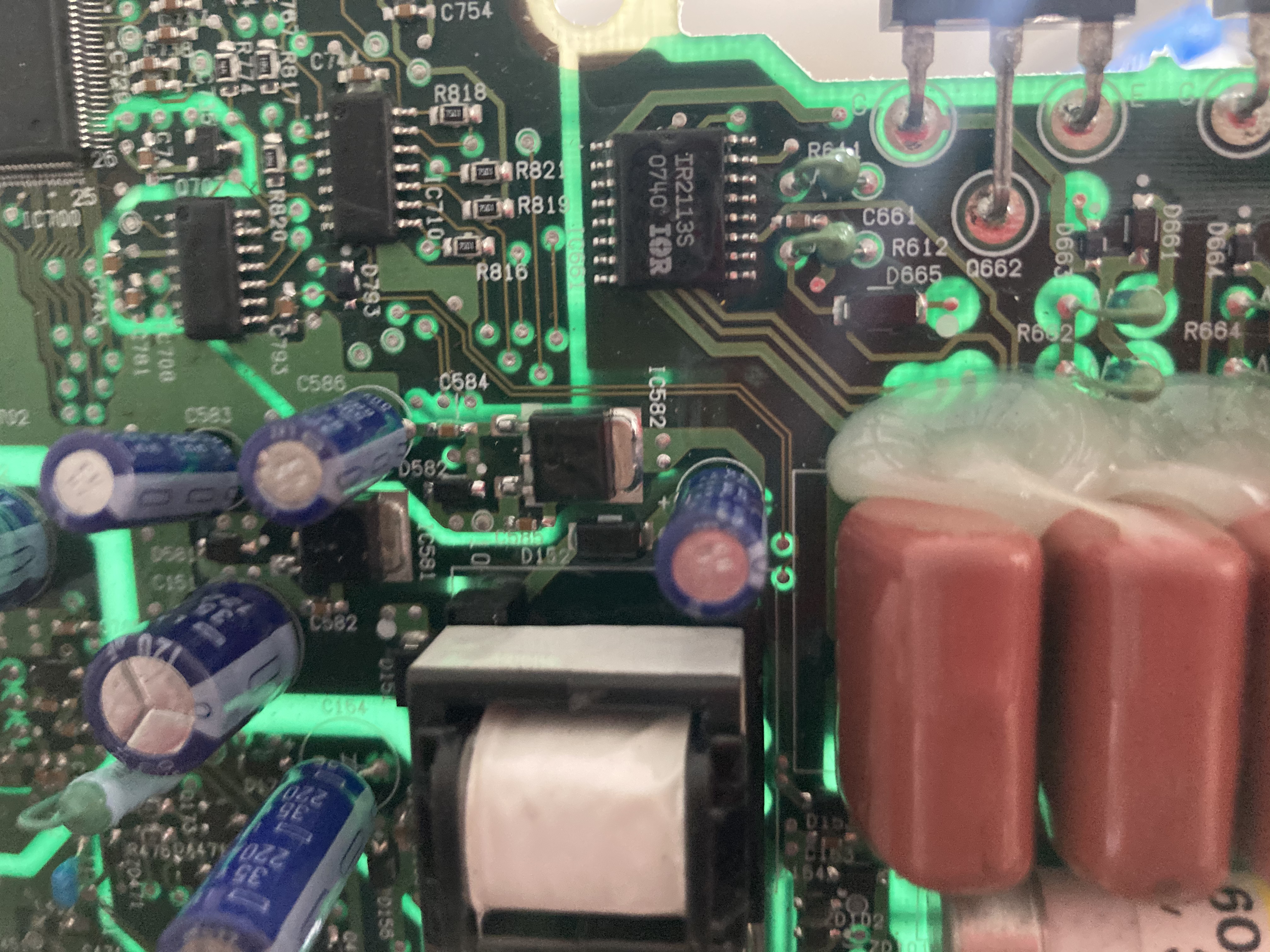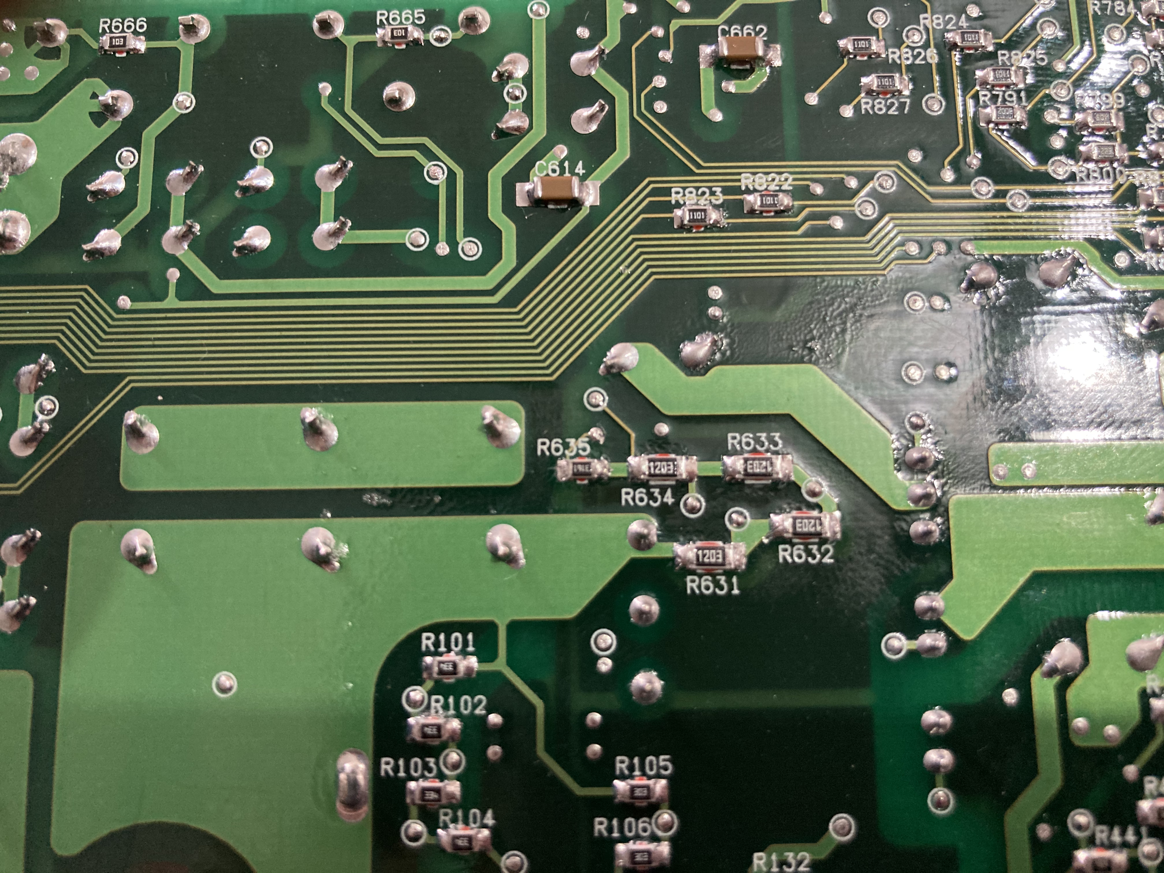 Ok I have found one voltage divider which runs off to the control chip a rear on top of the board it’s 4 120k (1203) (r631 r632 r633 r634 r634) and a 3.14k (approx can’t read code) (r635) which would give a reference voltage of about 1.5v from a 200v input so it’s believable. I don’t think I have anything to loose by trying to change the values here.