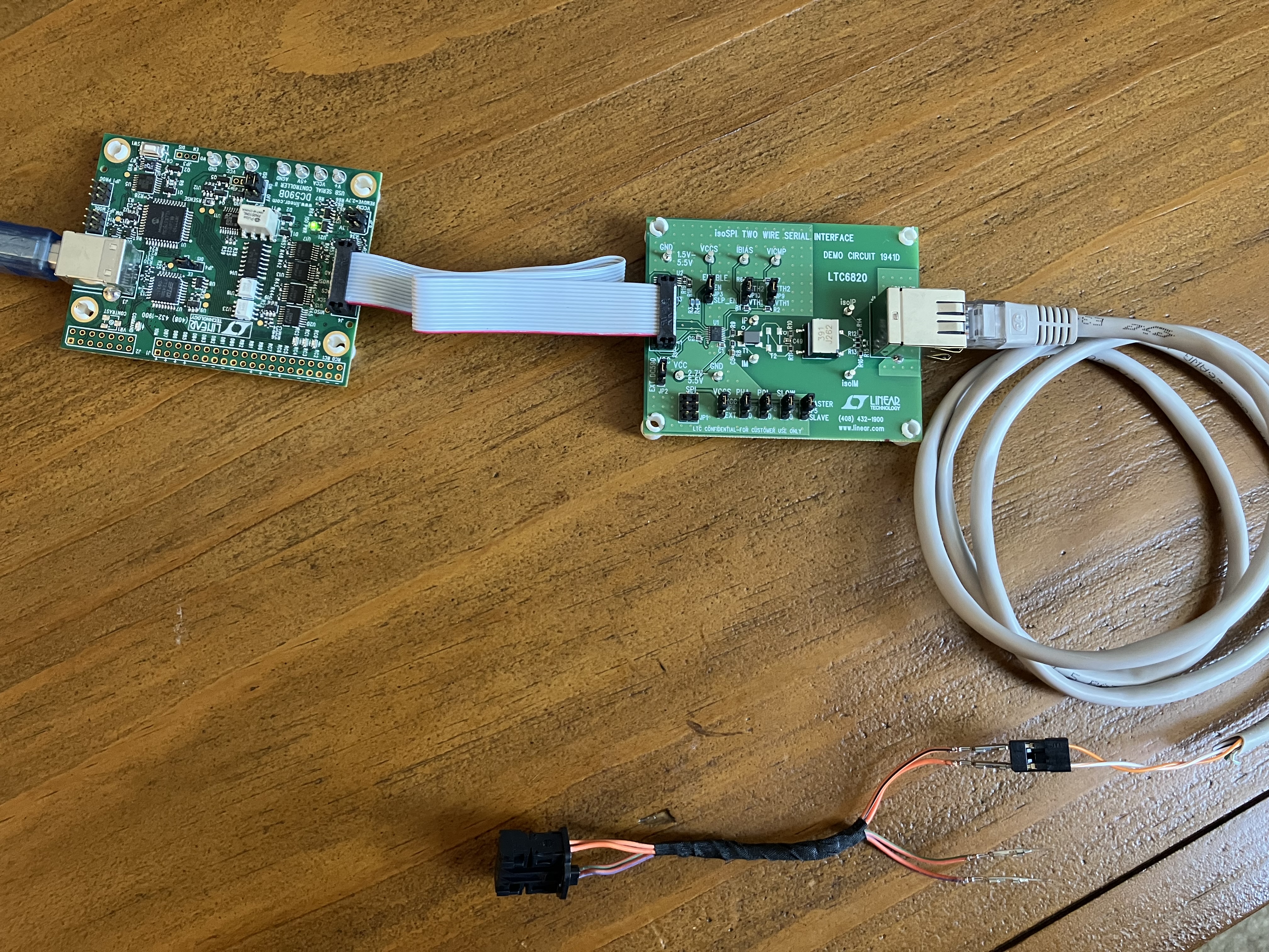 Here is my setup: Computer connects to the DC590B demo card. This can interface with a bunch of stuff (including a gas gauge driver I also have) but I am connected to the DC1941D. The RJ45 uses ONLY pins 1 and 2, which I connected to a connector so I can experiment with the final connection to the Mercedes BMS satellite. Now I don’t know which is SPI in and which is SPI out, and of those choices and don’t know which is IM and which is IP… so 4 possible configurations to test.
