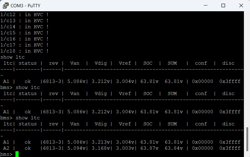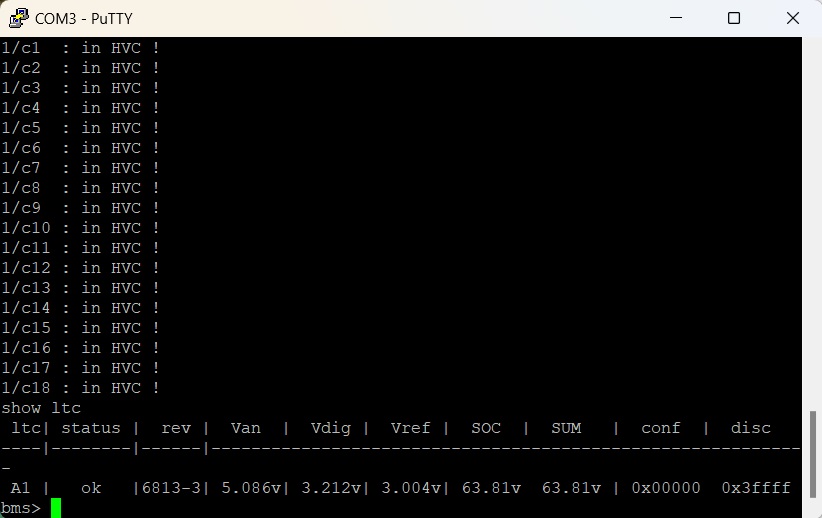 (Note I am getting "In HVC!" warnings on each cell. HVC is "High Voltage Cut-off", which I have not configured yet. The individual cell voltages are ar 3.55v, or somewhere between 20-50% SOC)