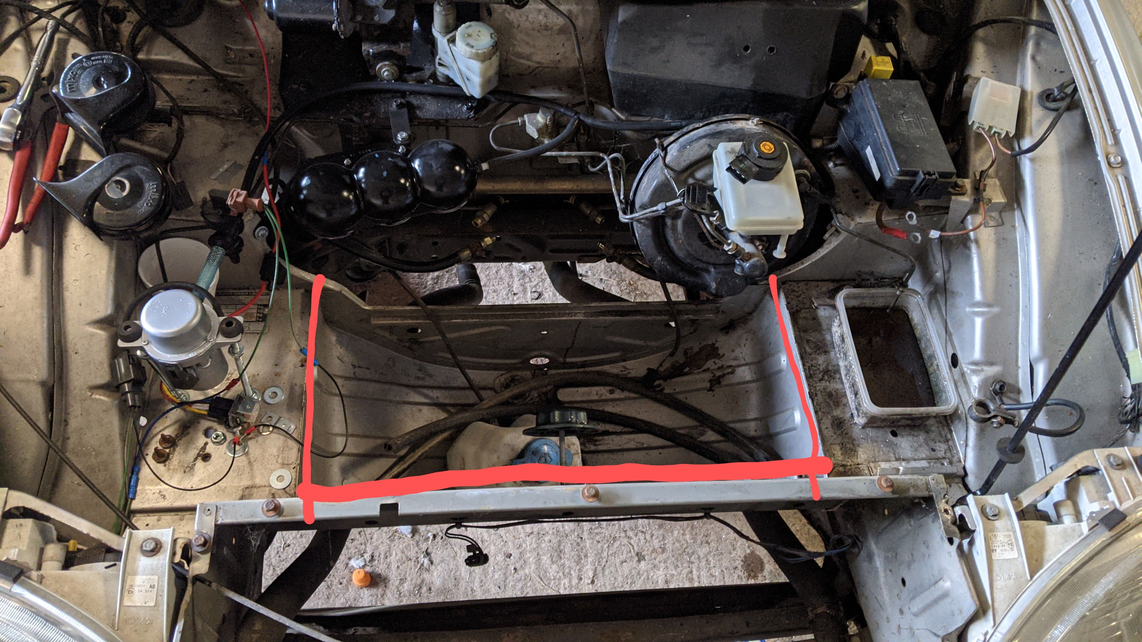 My initial idea is to cut it roughly where the red lines are, then add in a steel sheet across the top all at the same level. I can reinforce with a couple small bits of angle just in case the car did need the spare tyre holder to stay together. Then I'll have more than enough room below to put in a battery box. It will be nice and low to the ground and add some weight to the front which wouldn't hurt.