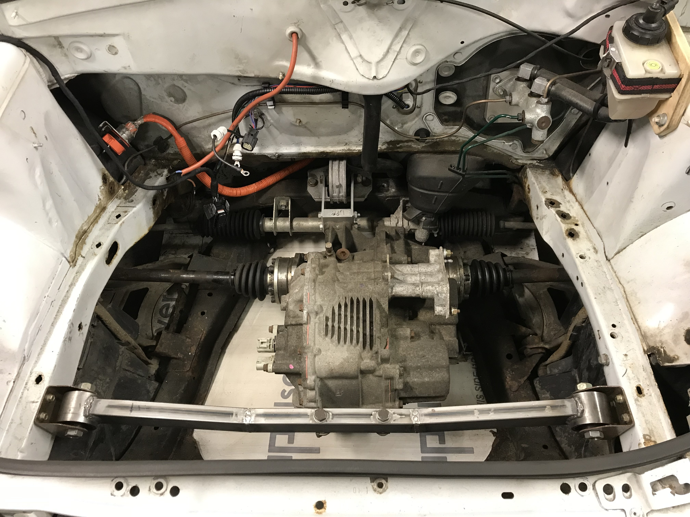 Leaf powertrain is out and MGR is mounted. Next is to mount inverter and inverter cooling system.