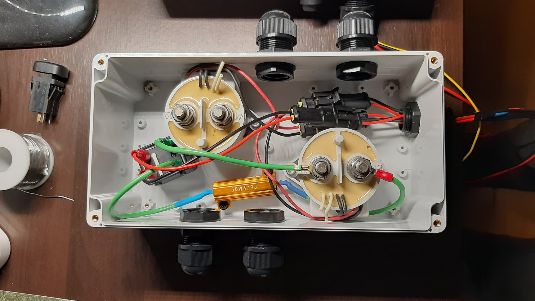 In junction box there are two Kilovac EV200 contactors, wich are basically are big heavy duty relays, one high voltage relay from toyota prius junction box and 47kOm 50W resistor. One contactor is separated and it is for positive line, second one is for negative line and in parallel with is there is a line consisting of prius precharge relay and resistor.