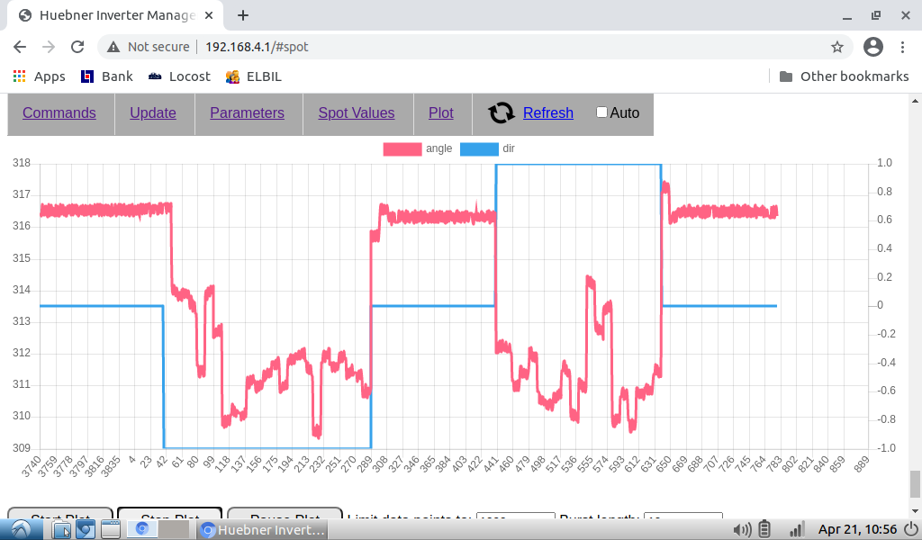 Tested again with stm32_foc_TIobs_nosyncadv.bin, instability is back. Made a plot as per below. Had to move the car slightly to get the instability to start. Hard to see with this scale but there are a slight oscillation in angle. Regarding the instability. I can hear it and feel it in the car and I also see an increase in battery current. It might be down to my combination of motor/resolver pole pairs, mass off the car, backlash in gearbox etc. Thats why you are unable to recreate it in your setup.