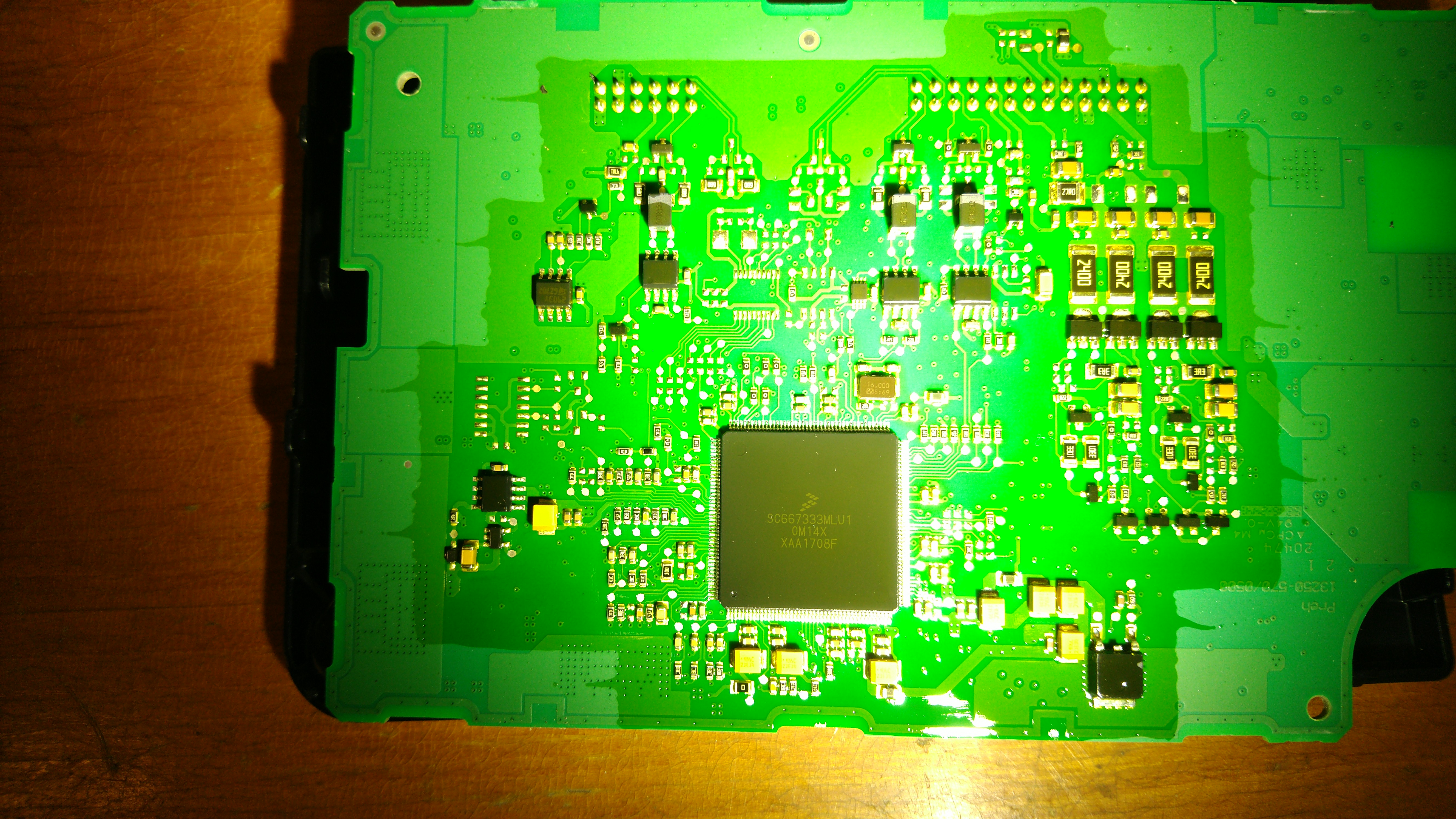 The BMS master has lots of goop and a ridiculously large Freescale chip underneath ("SC667333MLU1 OM14X XAA1708F"), and a Freescale HCS12 MCU on top with various little ICs.