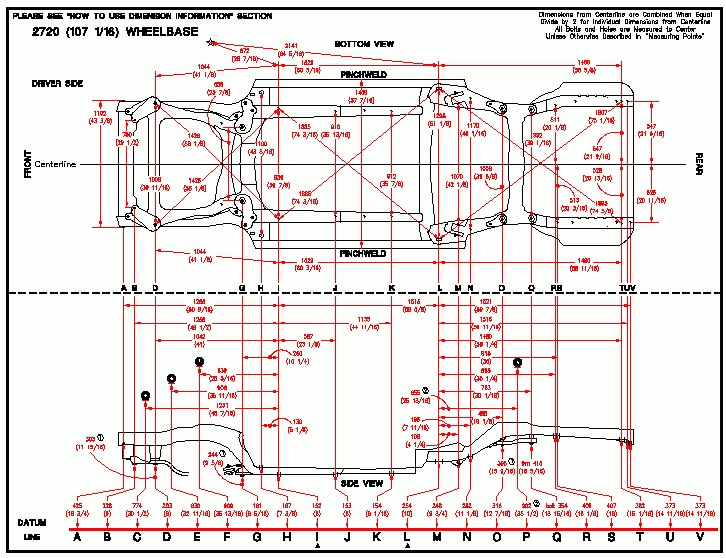 If you'd like to have a rough drawing of your vehicle's important frame-ish parts (as I call them), try to find a collision repair dimension drawing that pictures the vehicle from top and from the side, like the following one, and go from there.