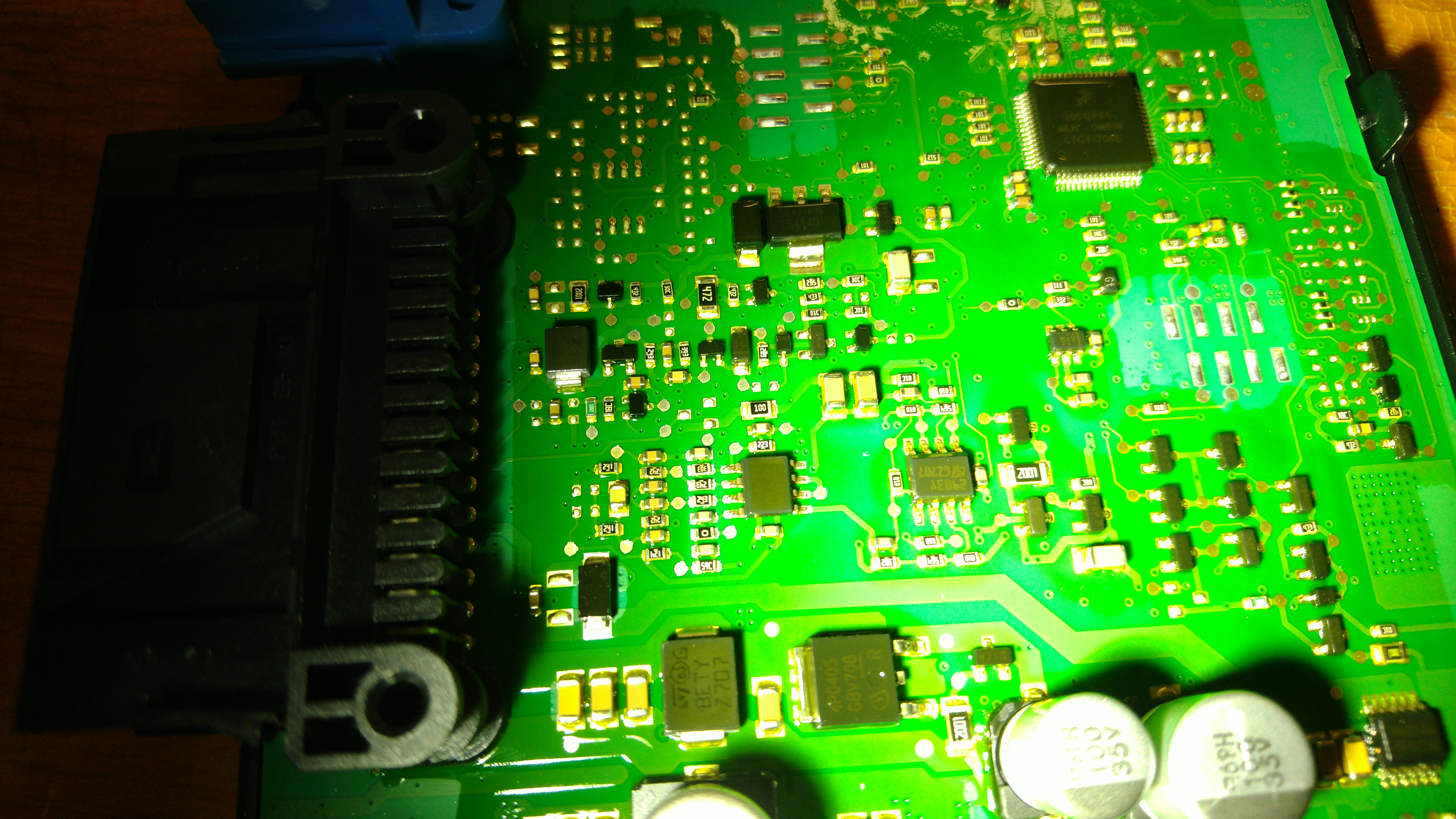 The BMS master has lots of goop and a ridiculously large Freescale chip underneath ("SC667333MLU1 OM14X XAA1708F"), and a Freescale HCS12 MCU on top with various little ICs.