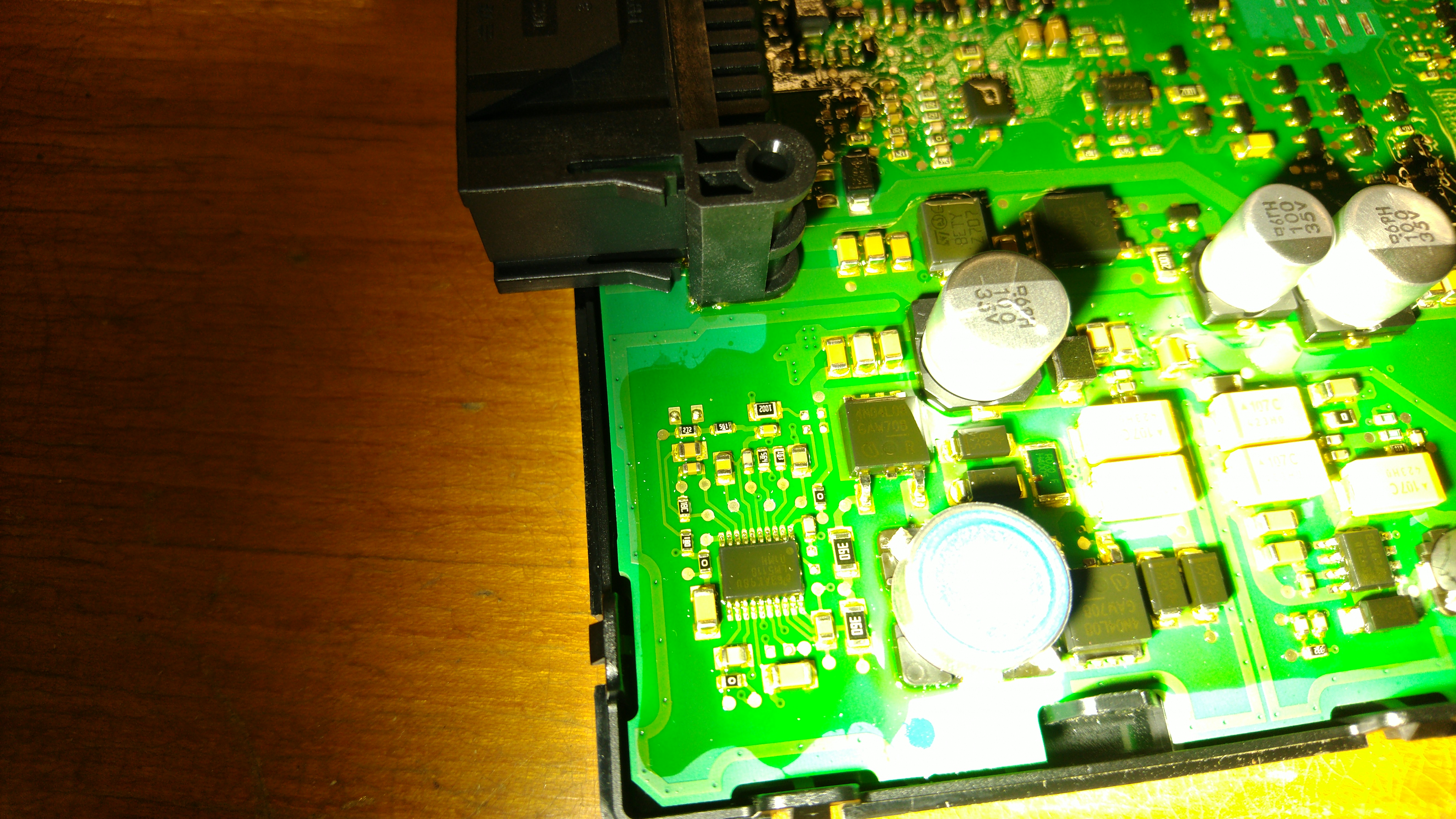 The BMS master has lots of goop and a ridiculously large Freescale chip underneath ("SC667333MLU1 OM14X XAA1708F"), and a Freescale HCS12 MCU on top with various little ICs.