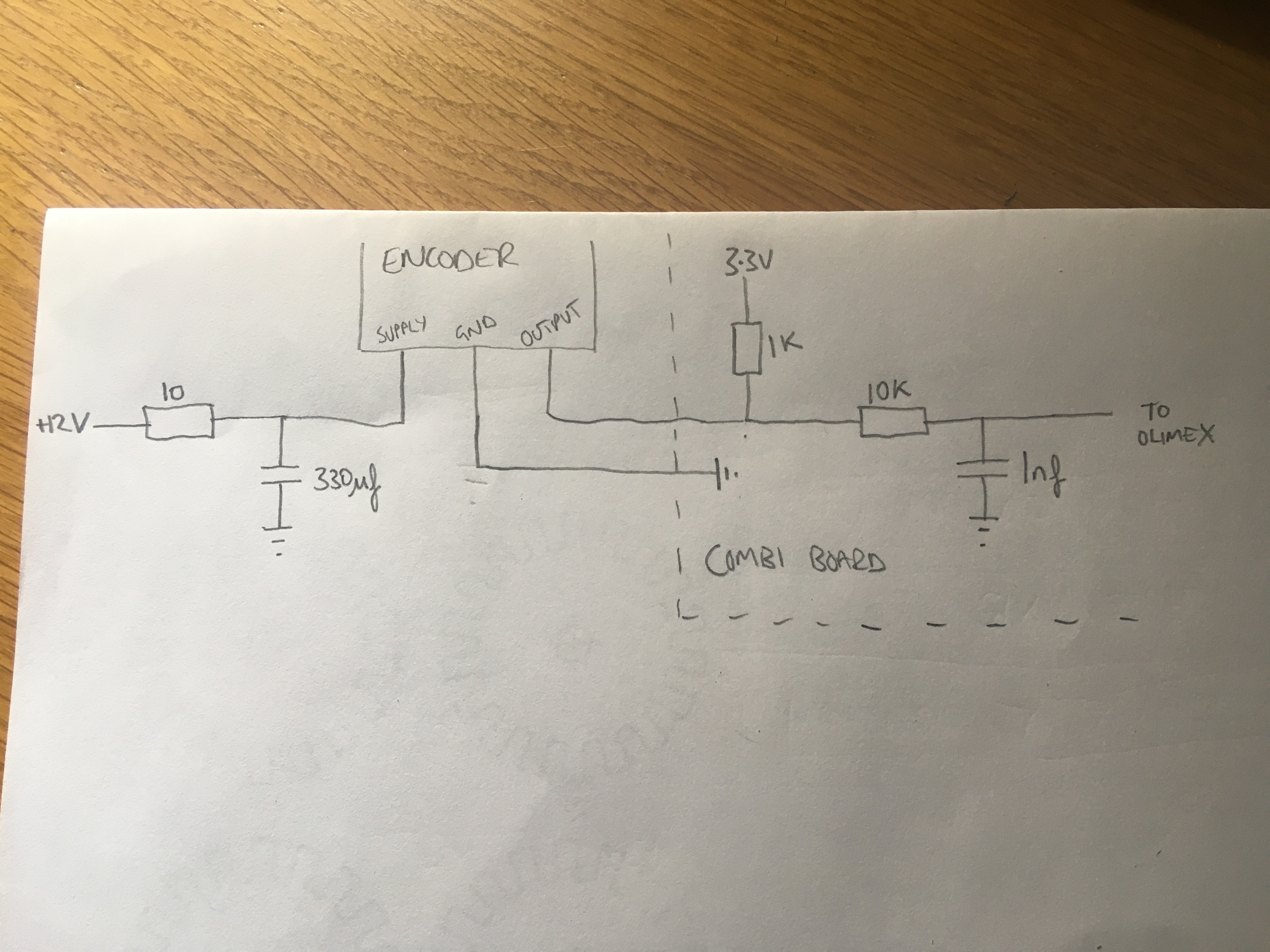 Wondering if there is need for a pull down resistor as 0V is not being registered by the olimex, despite encoder being push pull signal? I removed a pull up to 5V using 1.5K ohm resistor from the encoder signal line and that appeared to make no difference, so i now just have a 10kOhm resistor inline to olimex and a 1.3 nanofarad cap to gnd taking the 5V signal from 50 ppr Avago encoder.