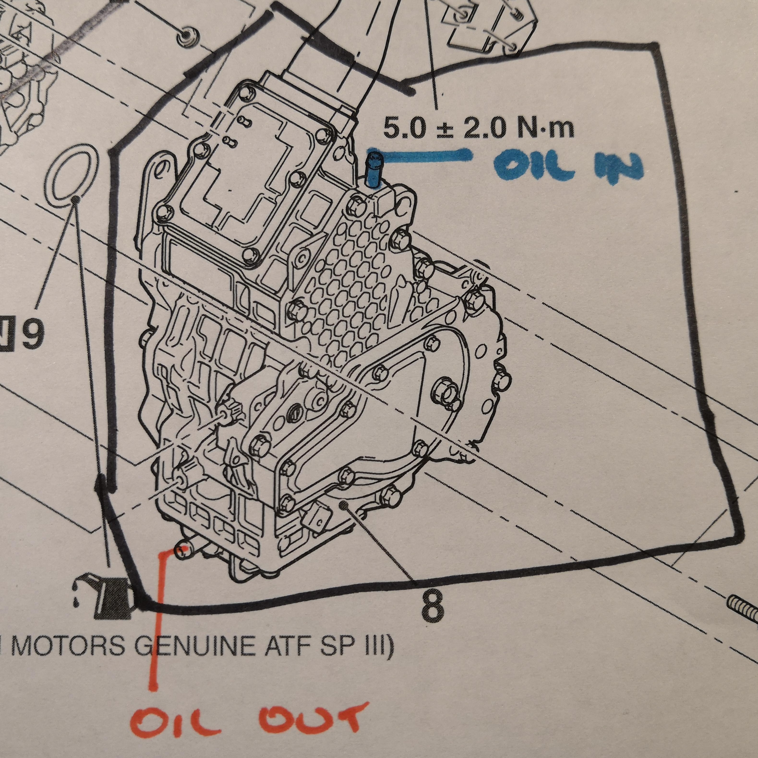 It wasn't immediately obvious to me which way the motor should be oriented, so back to the service manual I went. The diagram (below) was very helpful (forgive my atrocious drawing skills over the top of it). Once you realise which way the motor goes, it becomes pretty obvious: there's a lifting eye for craning it in and out at the top, and the oil pipes are fixed at the top and bottom.