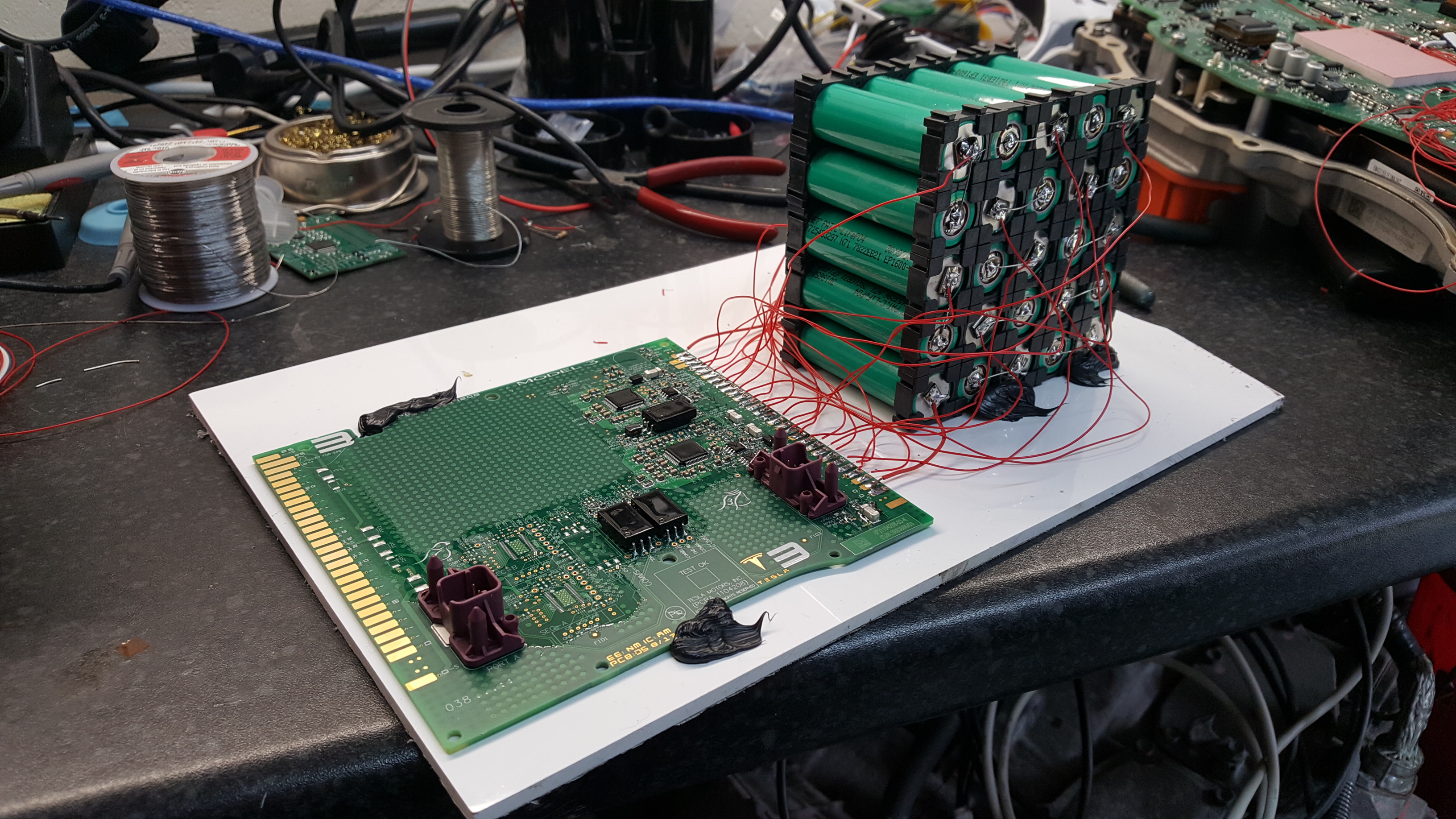 Right, back to the hacking. The next phase of this op requires a battery and slave board. Fun though it would be to haul around a full size model 3 brick, I decided to make a bench version from 25 x 18650 cells. This has the added advantage of allowing individual cells to be connected and disconnected allowing us to observe the data changes.