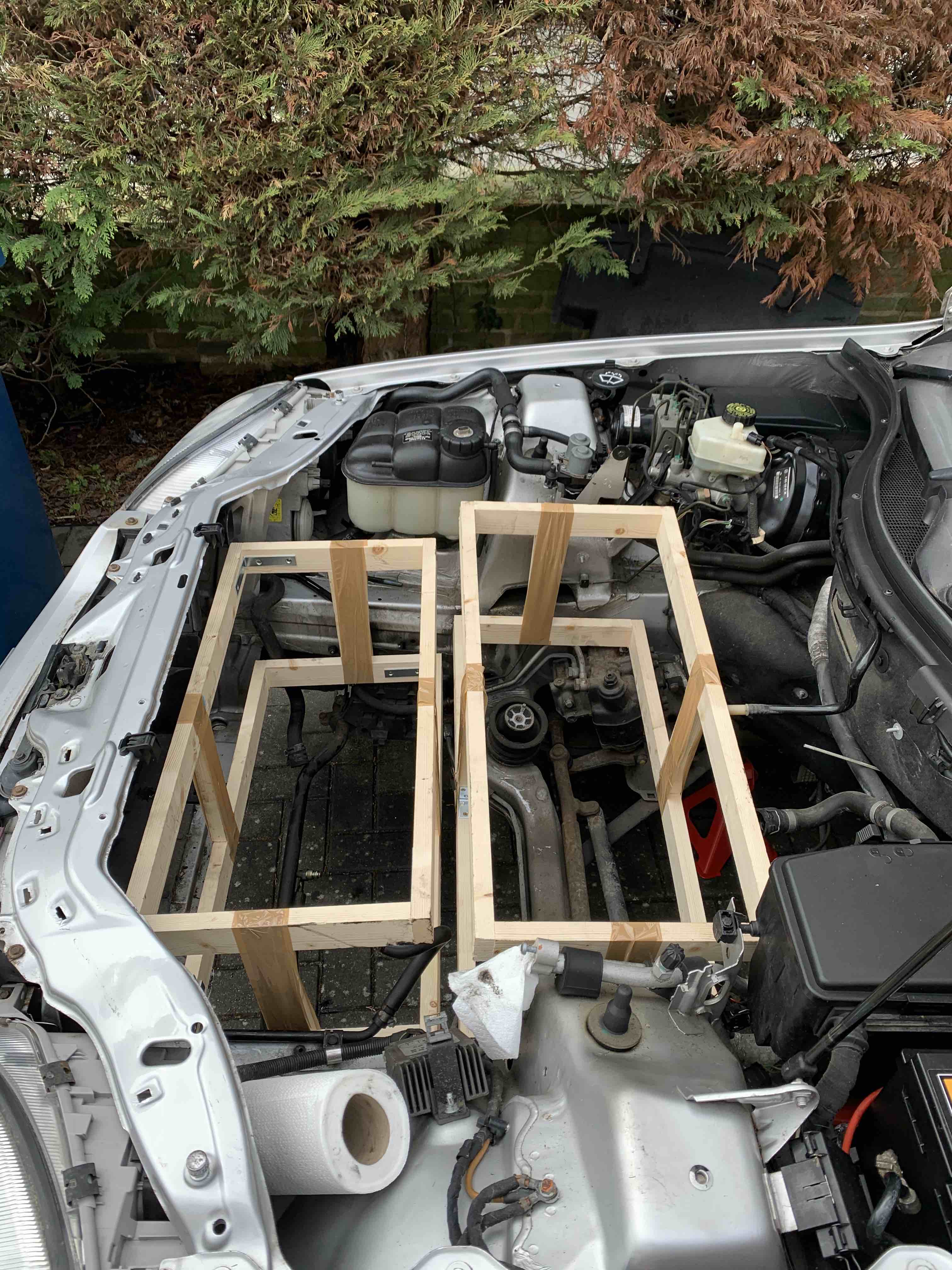 Since receiving the car back and cleaning the engine bay I’ve been busy playing around with different battery box configurations, defining the new 4 corners weight distribution and possible gearbox placement.