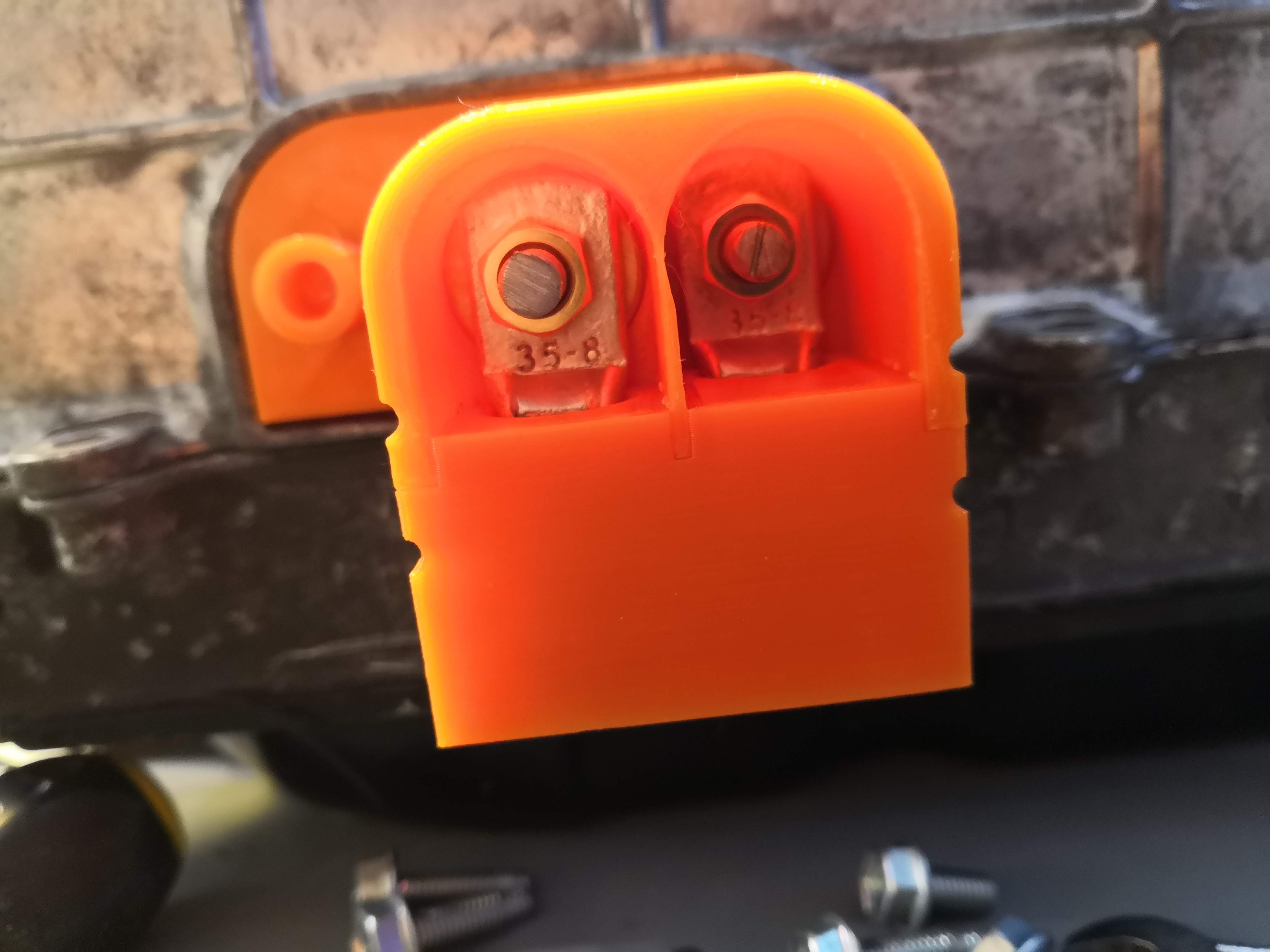 Right, the complicated one. This is my first pass at a 3D printed part(s) to house and seal in the battery connectors in the new location, using Damien's machined brass standoffs. It's not perfect yet but prints and fits together nicely.