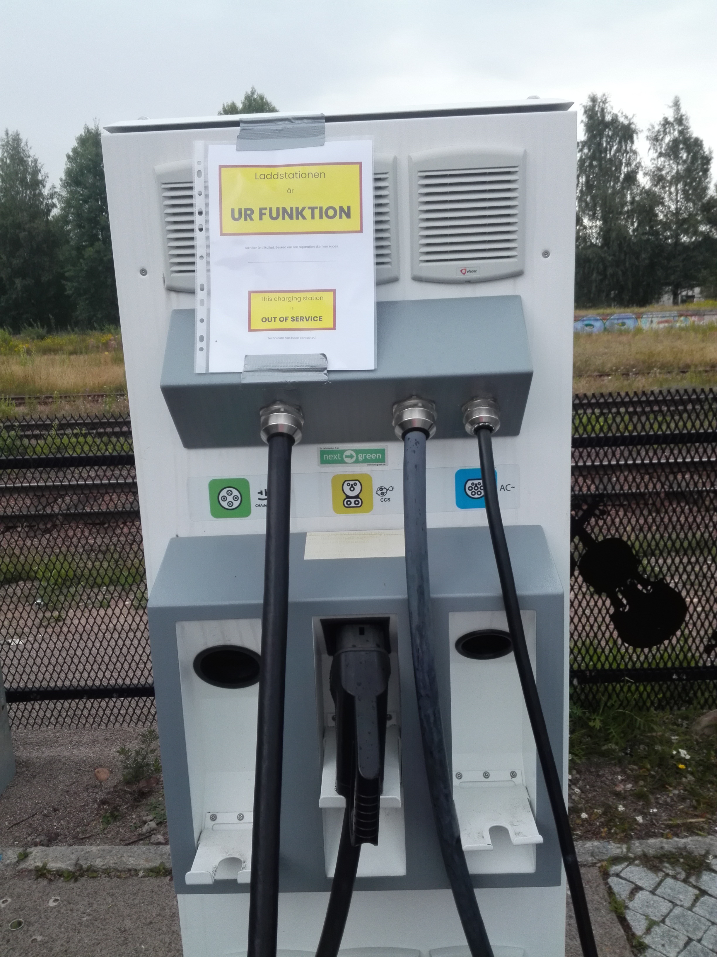 So repair will have to wait till Östersund. Meanwhile charged once for free at Tanumshede. The second time it didn't work and I had to use a payed charger nearby. Here in Årjäng there are two chargers but one is turned off!