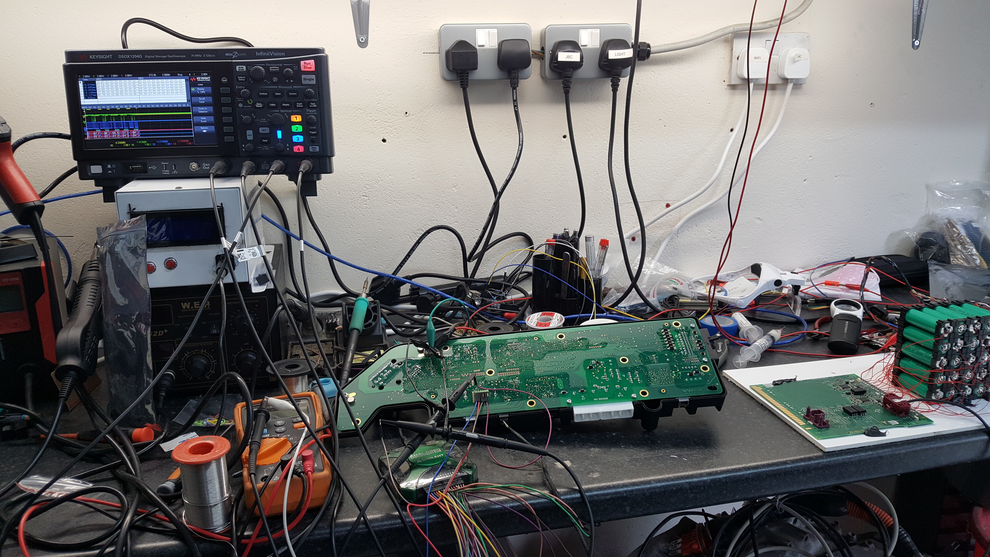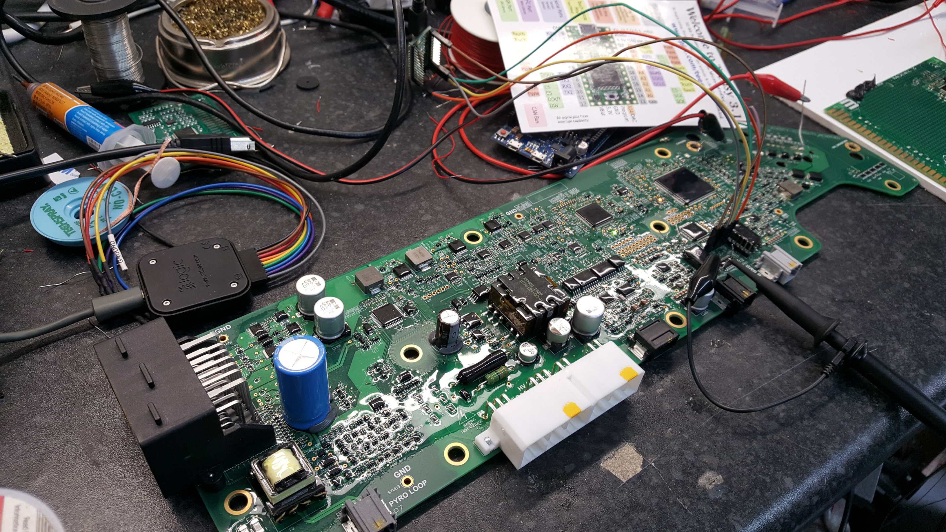 I have 2 hv controllers. One (mine) I have cut the tracks from Batman (Elon equivalent to the LTC6820) to the stupid NXP micro. This allows us to send isospi with our own device (arduino due) using the Tesla spec that the slaves will recognise. On the 2nd hv controller I can spy on the spi with the salae and watch the results over can to correlate what changes on the spi when I mess with the cell voltages and how that corresponds to the real life data sent out over can. Yeah, another Tour De Force:)