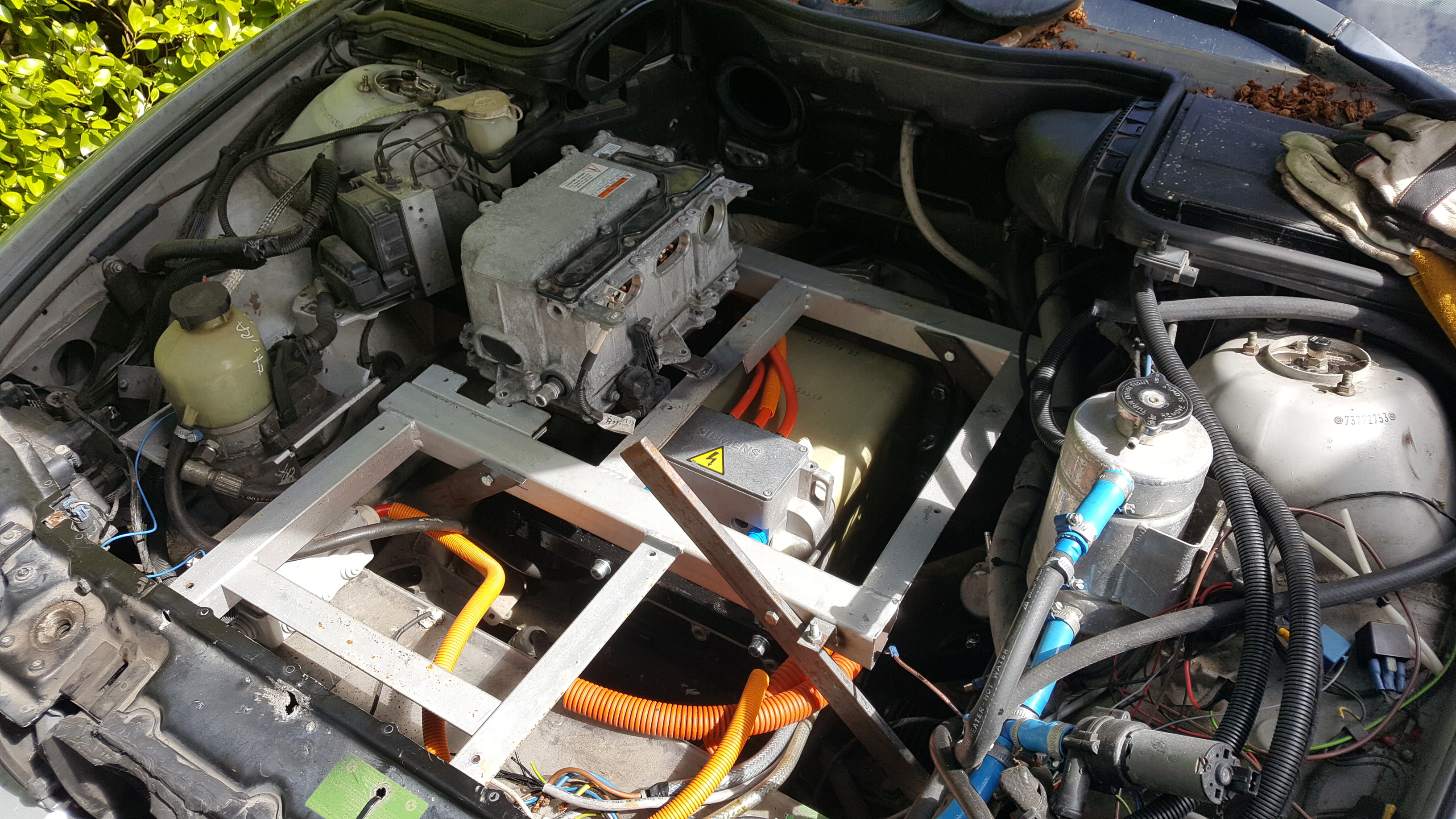 Making progress on the E39. Modified the mounting frame to take the Prius inverter. Trial fitting looks good so far.