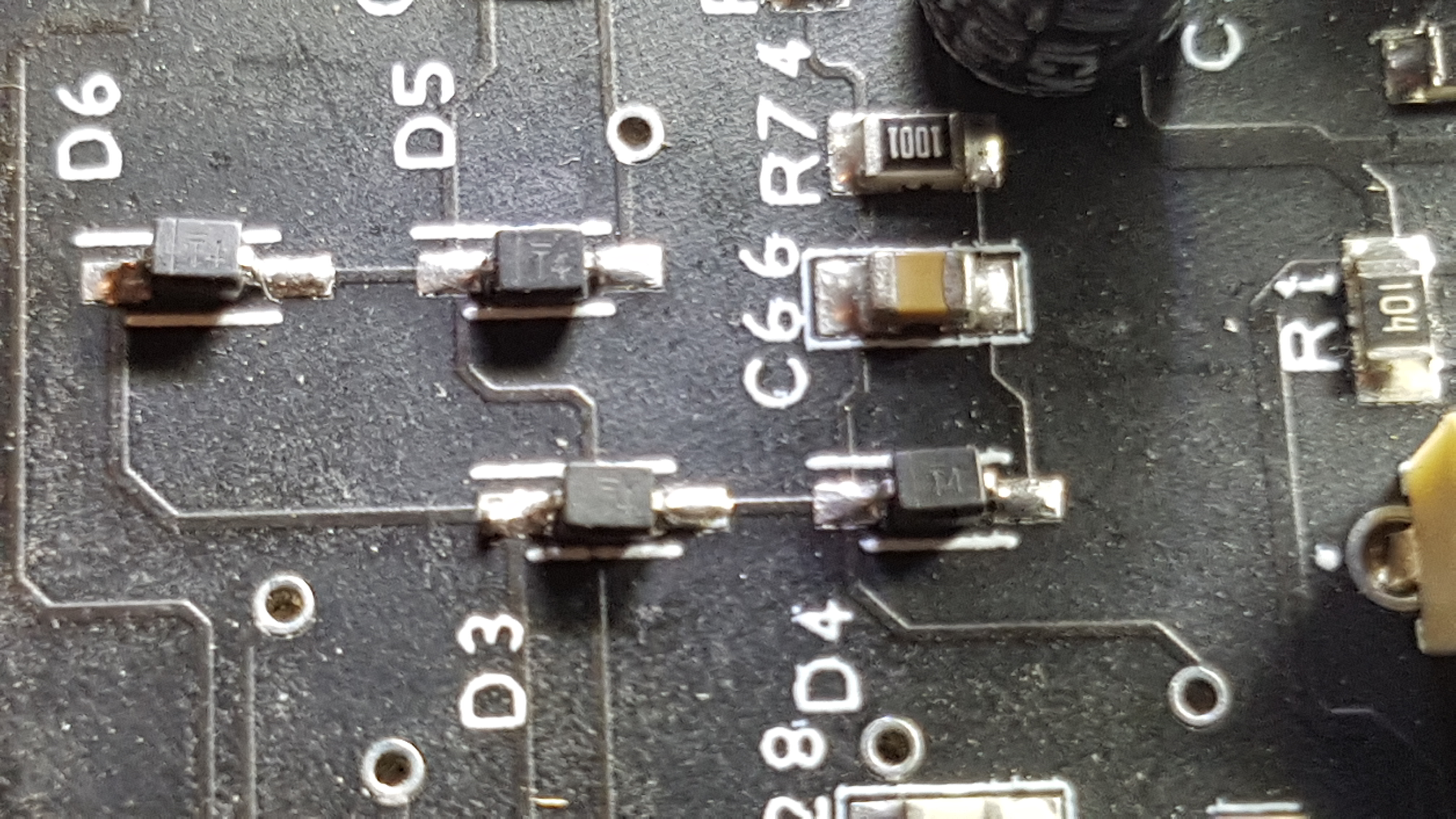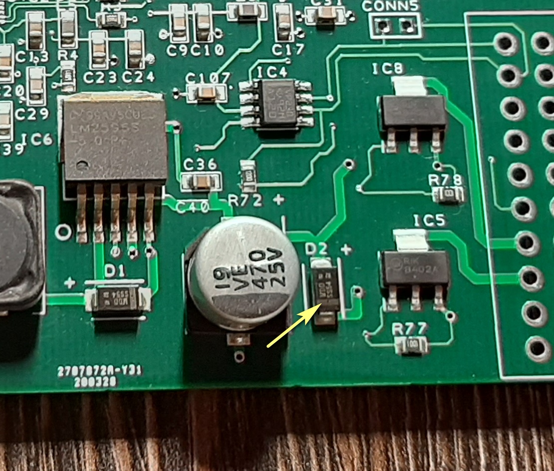 Note that both D1 and D2 in this photo have the grey line positioned away from the '+' symbol on the PCB. I've no idea if this is correct but they are consistent