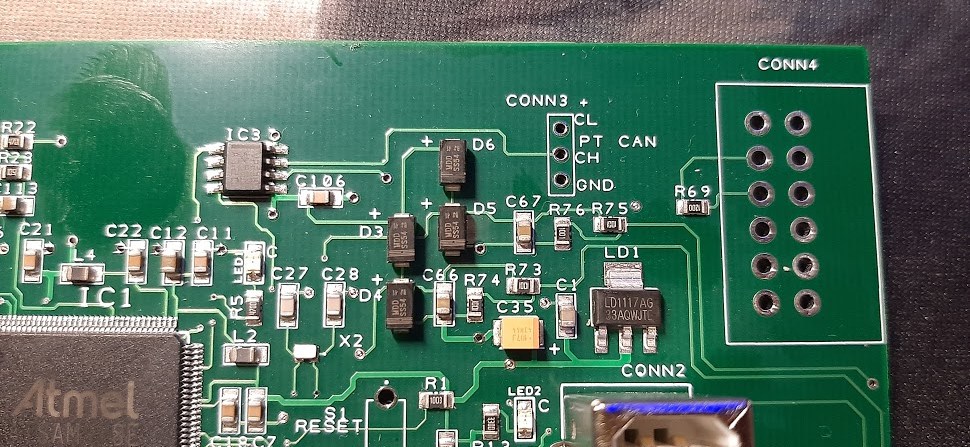 I tried to power up Leaf VCU v2 board and didn't succeed. As I've seen on photos here, there is a shottky diode on the power supply lane, with grey line facing other way.