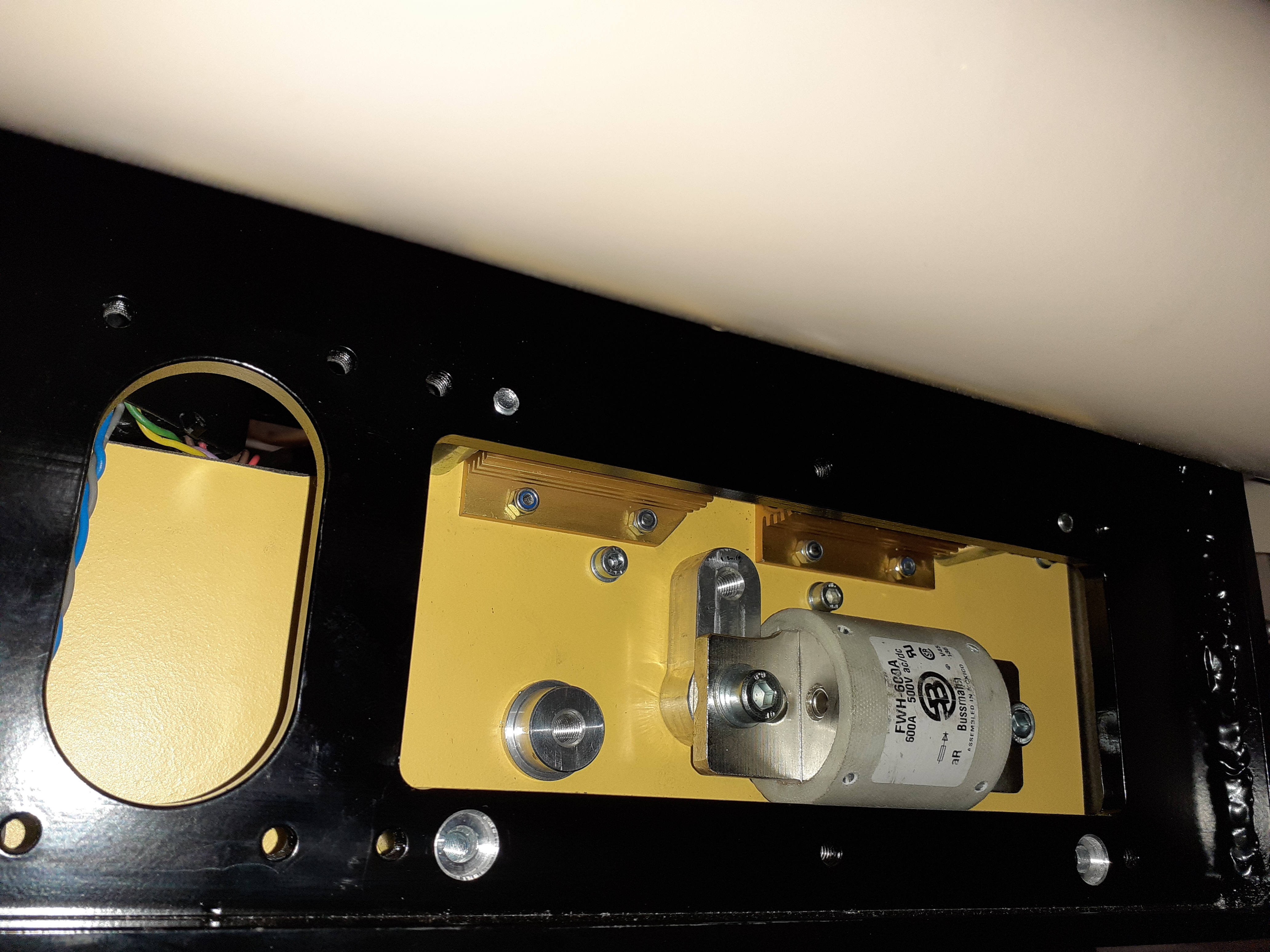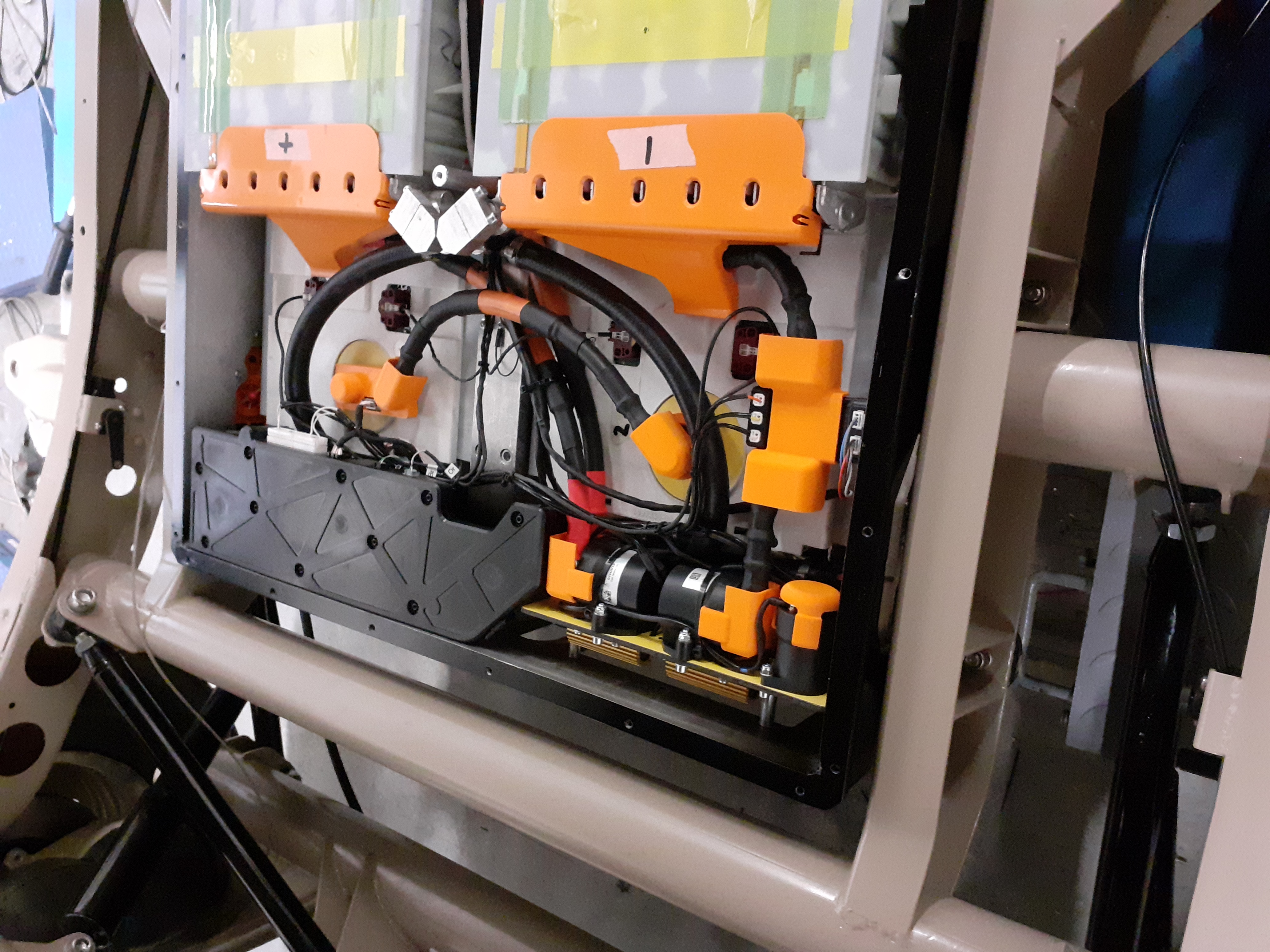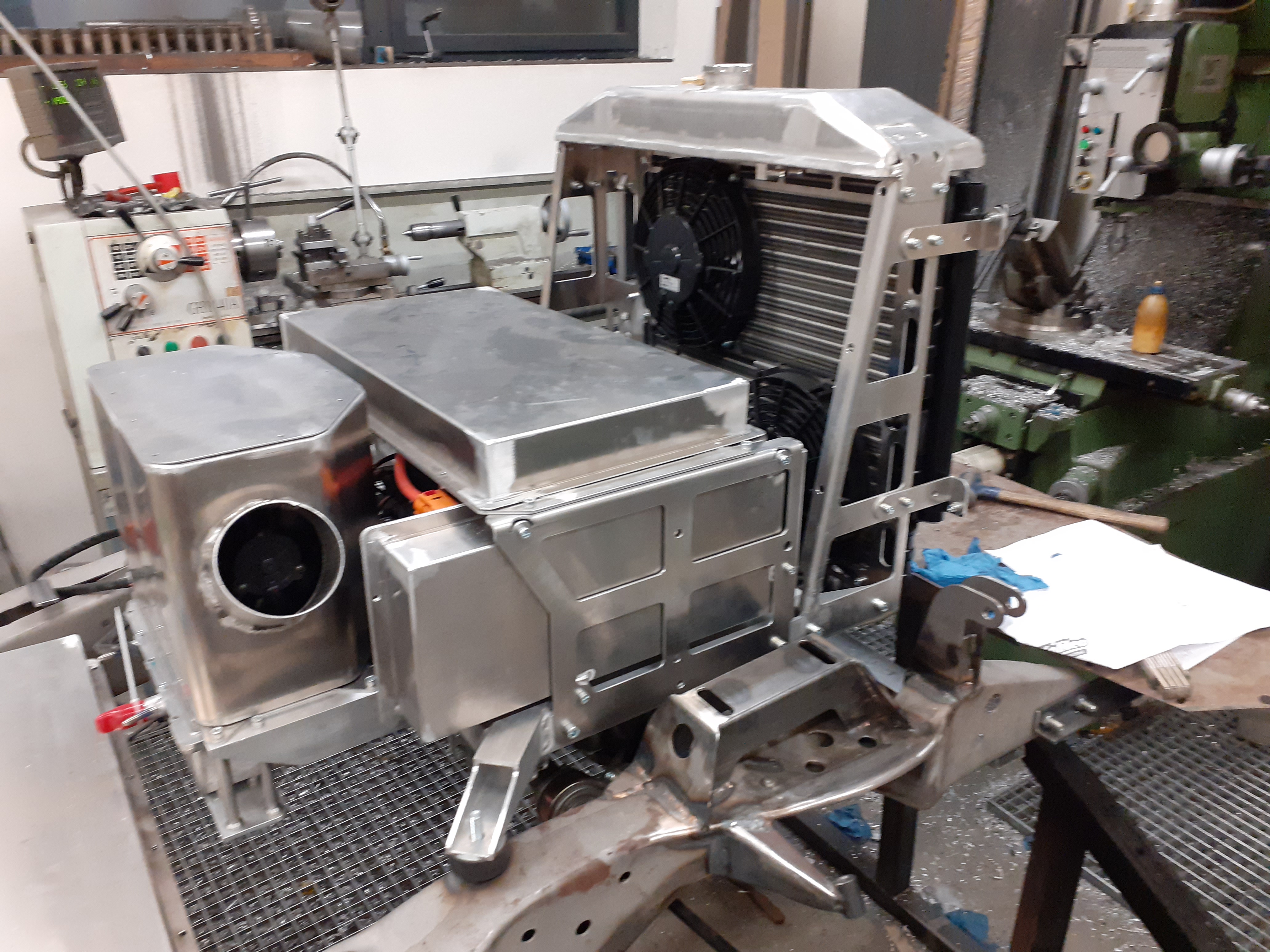 . The motor is in its new home, the drive shafts are mounted. The battery box is piped and wired. I had to make a few special parts for the water pipes, otherwise the cover would not fit. The box also houses the main and pre-charge relays, as well as the main fuse. The current is measured by an ISA shunt. In addition, I installed the original model 3 shunt to make the original BMS happy. The fuse can be reached via an extra cover, as are the connections for the motor on the back and for the charger and accessories on the front of the box