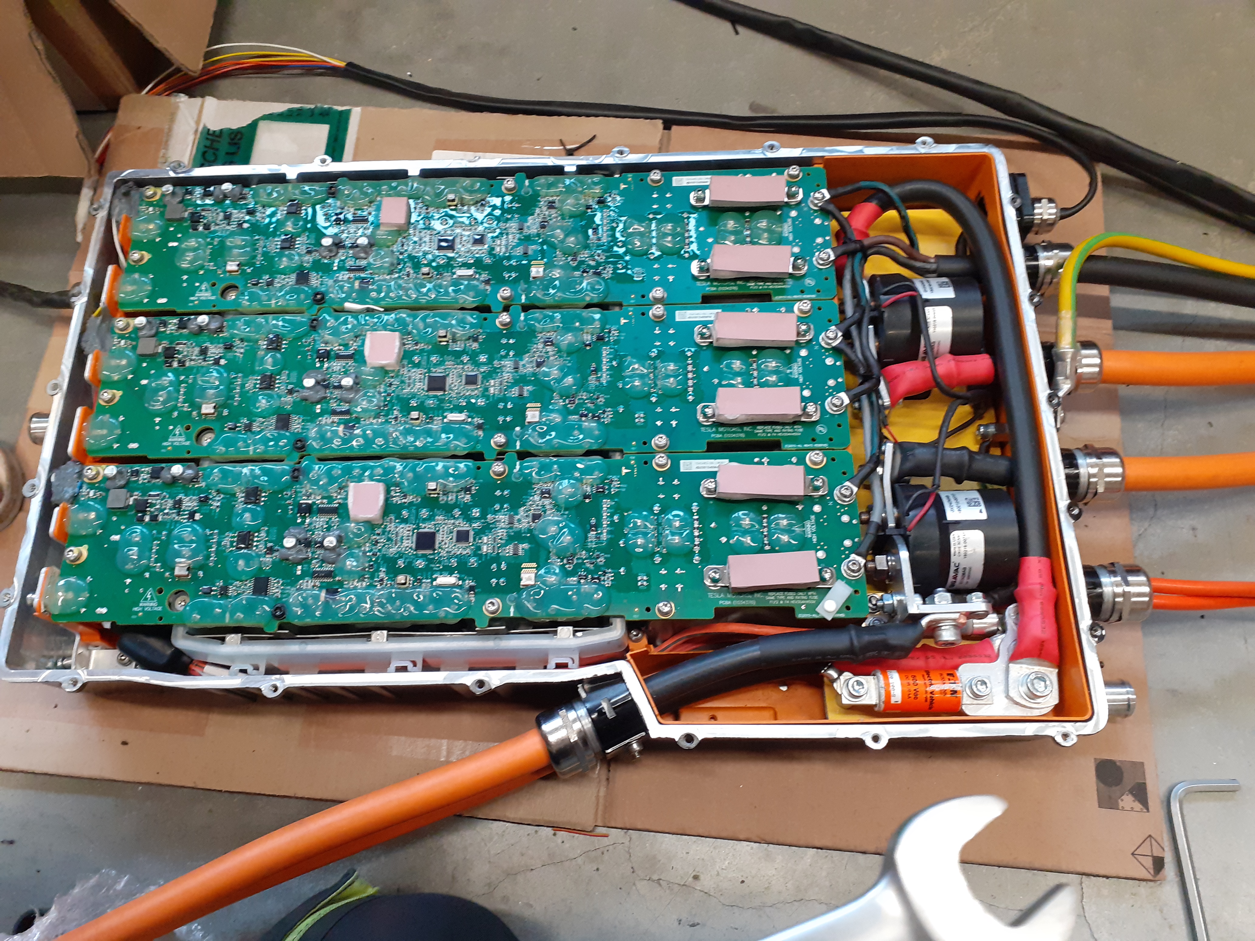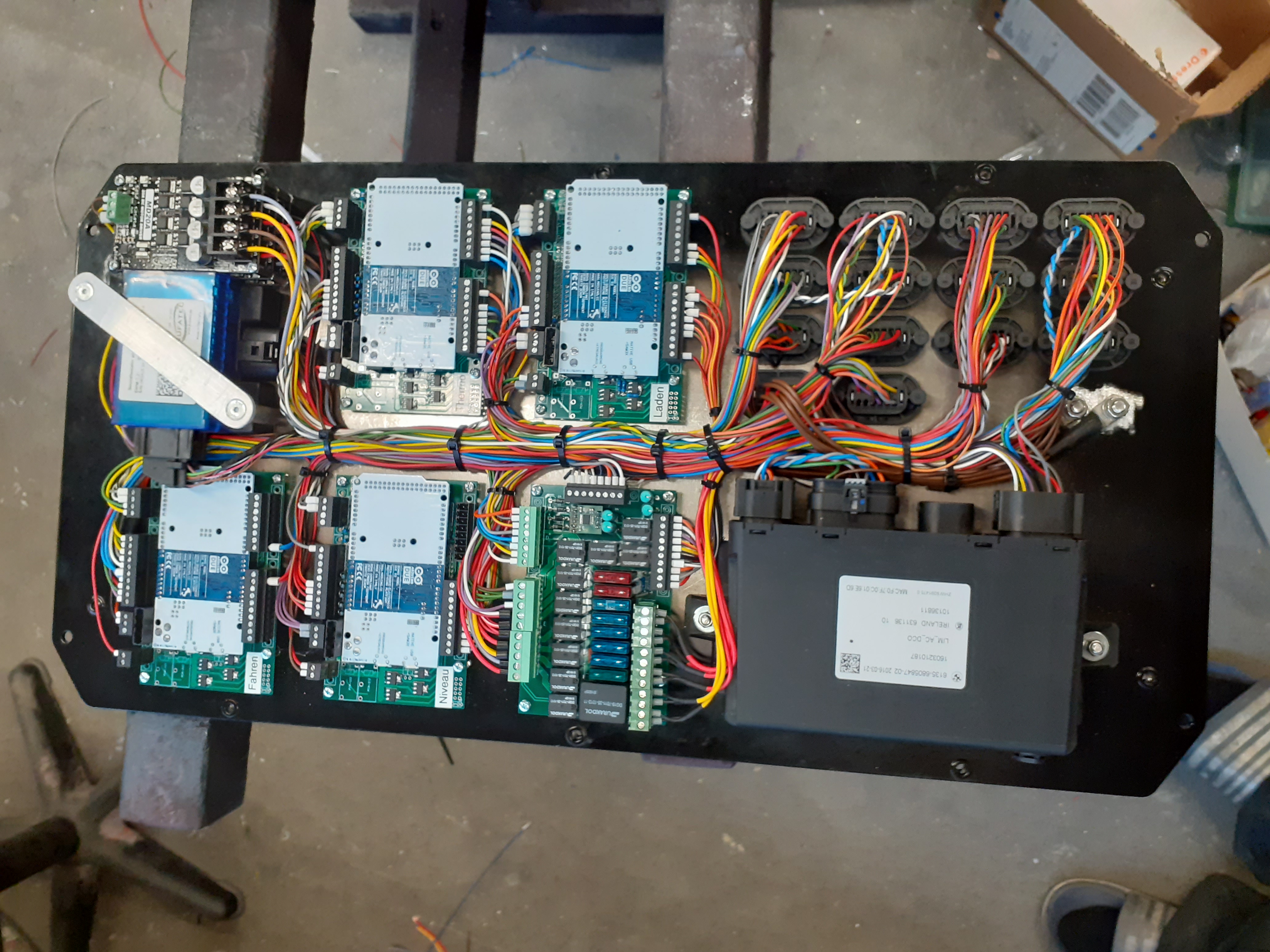 i have built a waterproof box that is housed in the engine compartment. It contains all the controllers that are necessary for driving and charging. There are 4 arduino DUE. One measures the spring height and the pressures in the air springs and controls the air compressor and the valves. One takes care of everything that has to do with heating and cooling, i.e. PTC cabin heater, battery heating, A/C compressor, fans, water pumps and bypass valves. One is for charging and controls the BMW LIM for fast charging and the Tesla generation 3 AC charger. No Damien hard or software for it! The last one filters the accelerator and brake pedal signals by measuring the speed on the front axle, comparing it with the drive unit speed and adjusting it if necessary to prevent the driven wheels from slipping. There is also a sound generator that simulates a V8 engine with a 4-speed automatic. And of course the BMW Lim and all the necessary fuses and relays