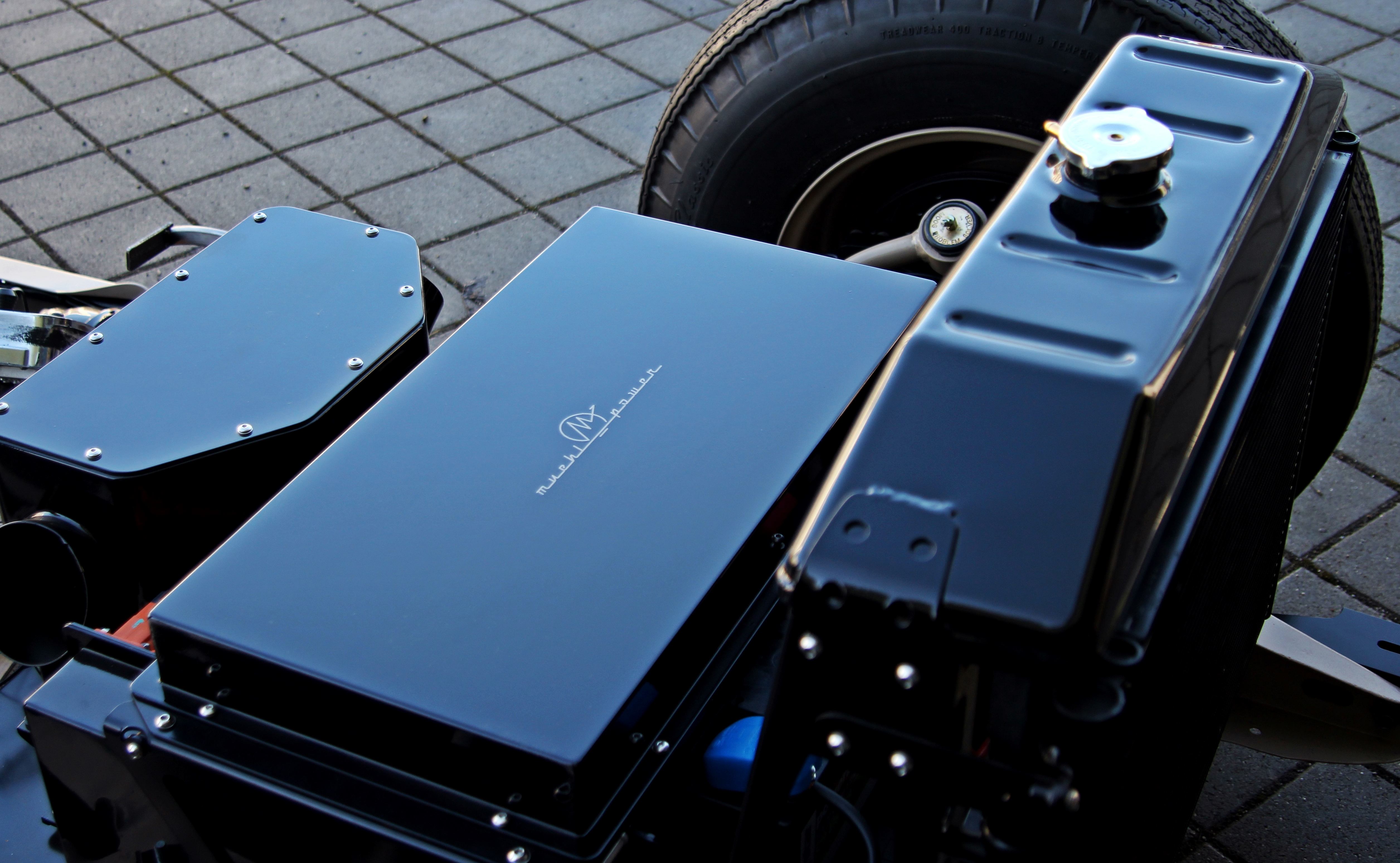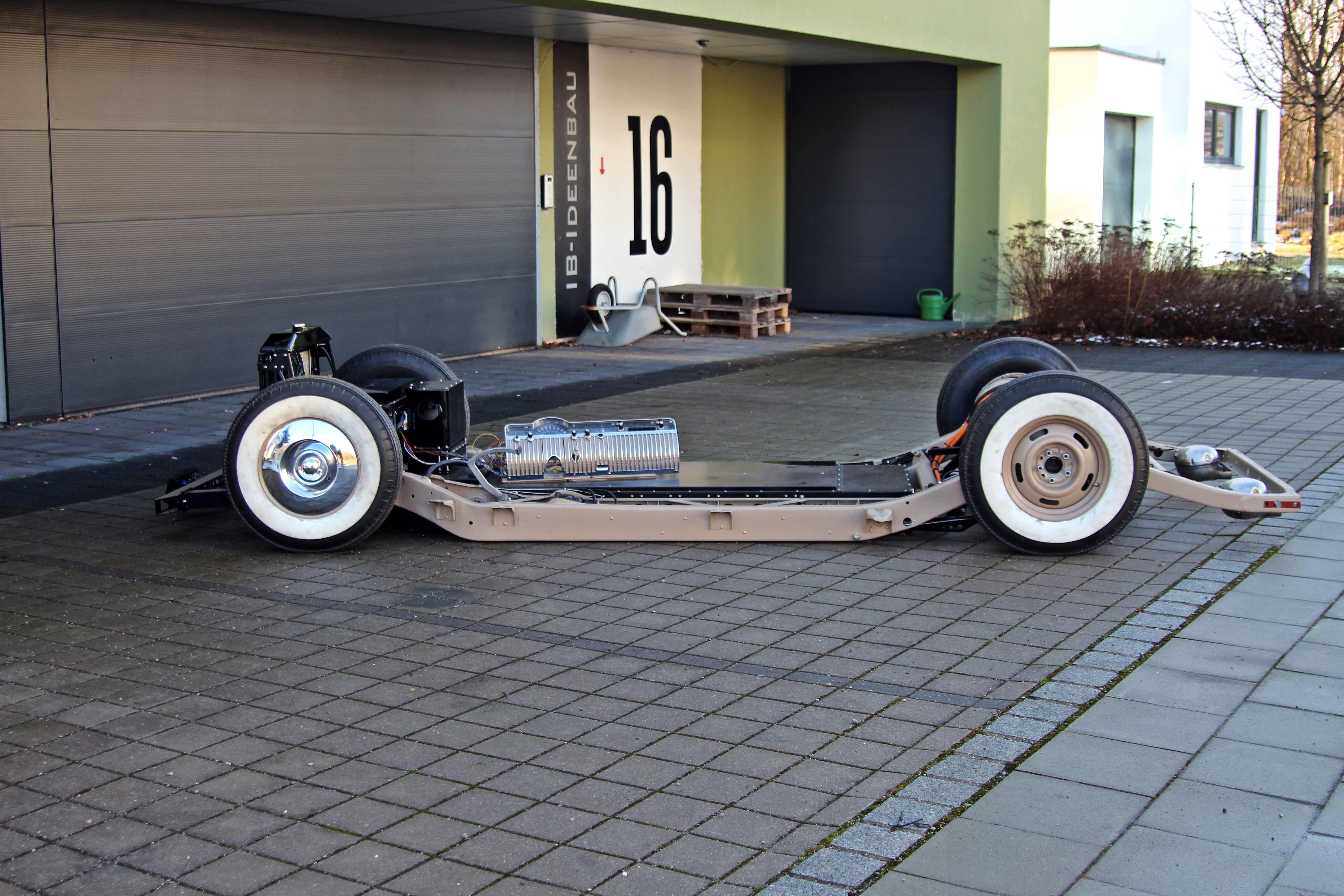 Next, the entire technology such as 12v battery, air compressor, heater, A / C compressor, cooler, charger, HV junkion box, vacuum pump is installed in the former engine compartment. This gives me a chassis that is ready to drive. The body is then put over it and fastened with a few bolts. The only connections are an electrical connector (no HV) and the steering.