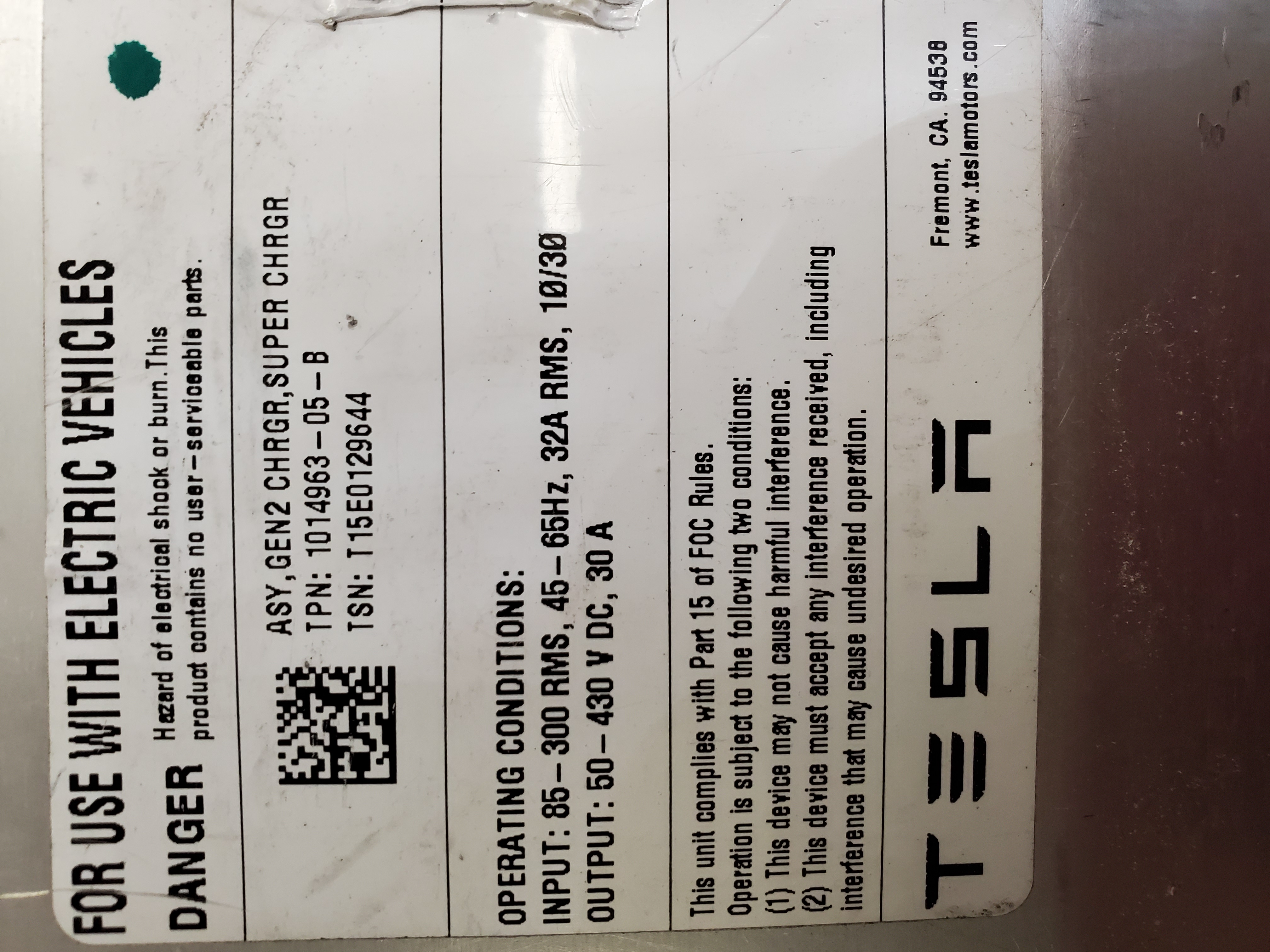 After getting another batch of 4 chargers (luckily for next to nothing) that didn't work, we realized that the chargers were from a scrapped Tesla Supercharger, 1014963-05-B. It appears that Tesla scrapped a bunch of V2 Superchargers last year and that a number found their way onto the market. Notice the description after the part number