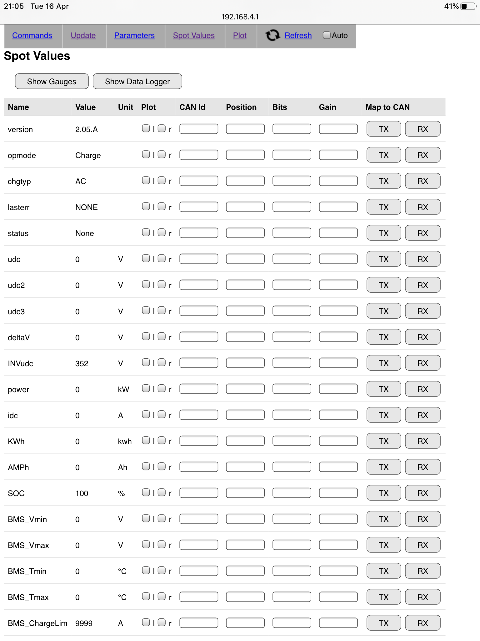 At the moment, I am working on the AC charging, getting the specific CAN message that is required in order to activate the charging. I’m using the ZombieVerter VCU with 2.05.A, the original type2 connection and AC cable to the wall. I’ve tested to set up and was able to replay kind messages which works, and I am able to get the VCU into charge mode, however, I cannot seem to come on the power. My Pwrspnt is set to 1500 but unfortunately makes no change.