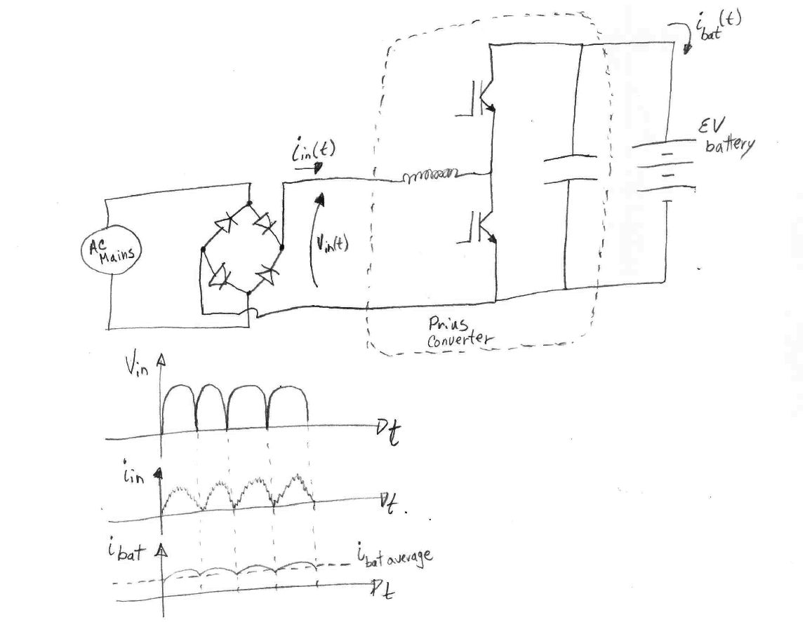 The rectified mains voltage would come in to the inverter converter where the battery would normally connect in a Prius, then the battery of the EV would connect in parallel to the main capacitors on the DC bus inside the inverter converter - right? (see sketch).