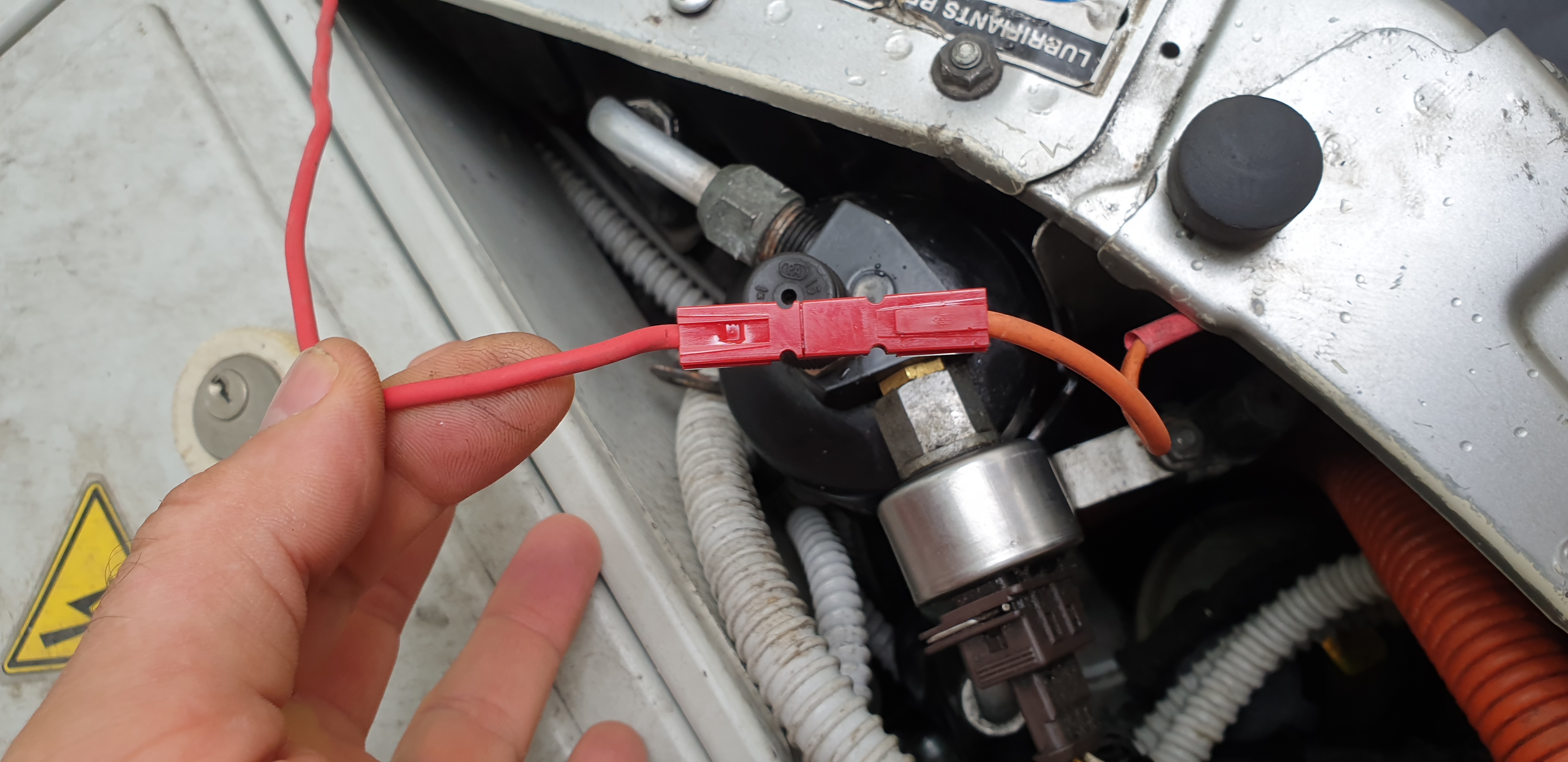 So i pulled wire out of connector and spliced another (orange) cable into it. After protecting connection with heatshrink tubes i pushed relays back into their place with additional orange wire going towards 30A relay. I use coolant pump signal to start this relay which will then run coolant fans at drive or at charging. I like to keep connection simple for now, but later i intend to harvest CAN signal from chargers which report temperature and i will slave that relay to DUE coolant output.