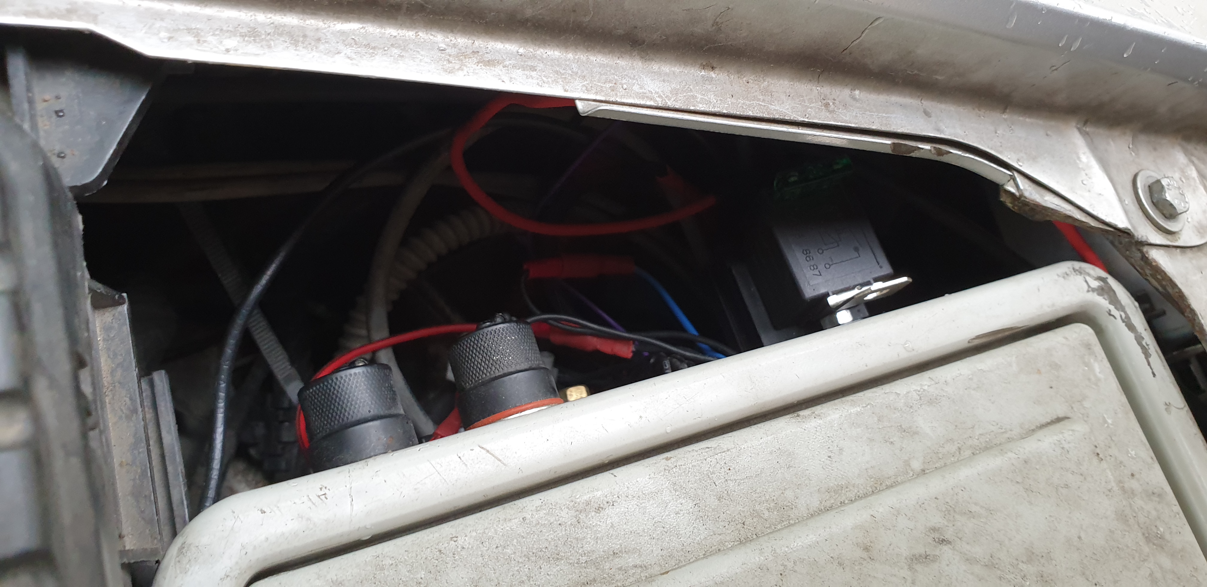 I mounted the box to the place of exhaust. While i thinkered with idea to suspend it the same way as the exhaust, rubber blocks cause it to hang too low, not good for safety. In the end i used two M8 bolts to firmly attach the box to the rear battery box.