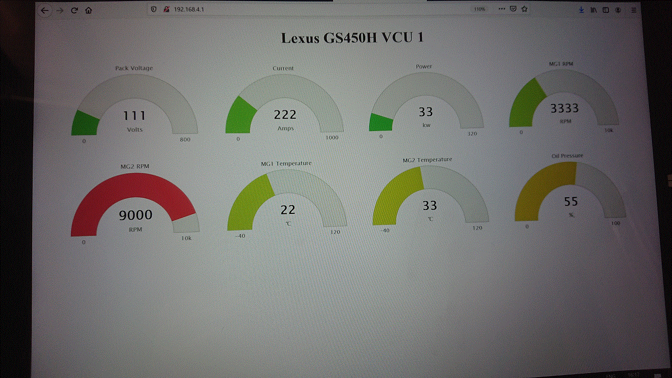 The updated ino and data folder were then flashed onto the ESP and it was tested on the VCU board once again, and this time the gauges and values appeared as normal and the MG2 rpm was now registering as expected, so the ESP appears to be working correctly now. I have not tested with the running gearbox but it is reading the correct values being sent from the GS450H VCU code, so all looks good.