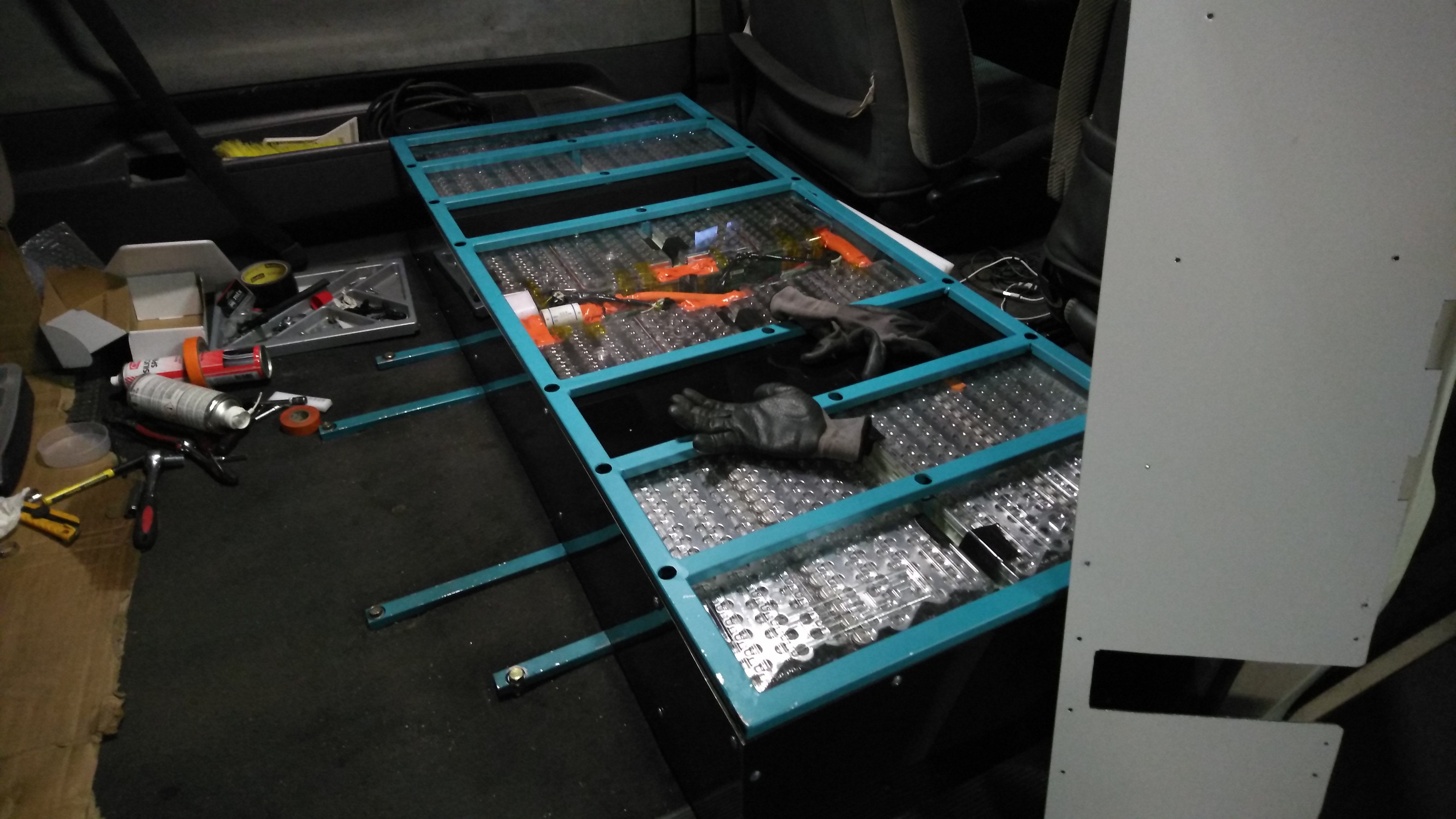 - 12 Tesla Model S battery modules installed in place of the second row seat inside a steel frame with polycarbonate and aluminium-plastic composite sheeting,