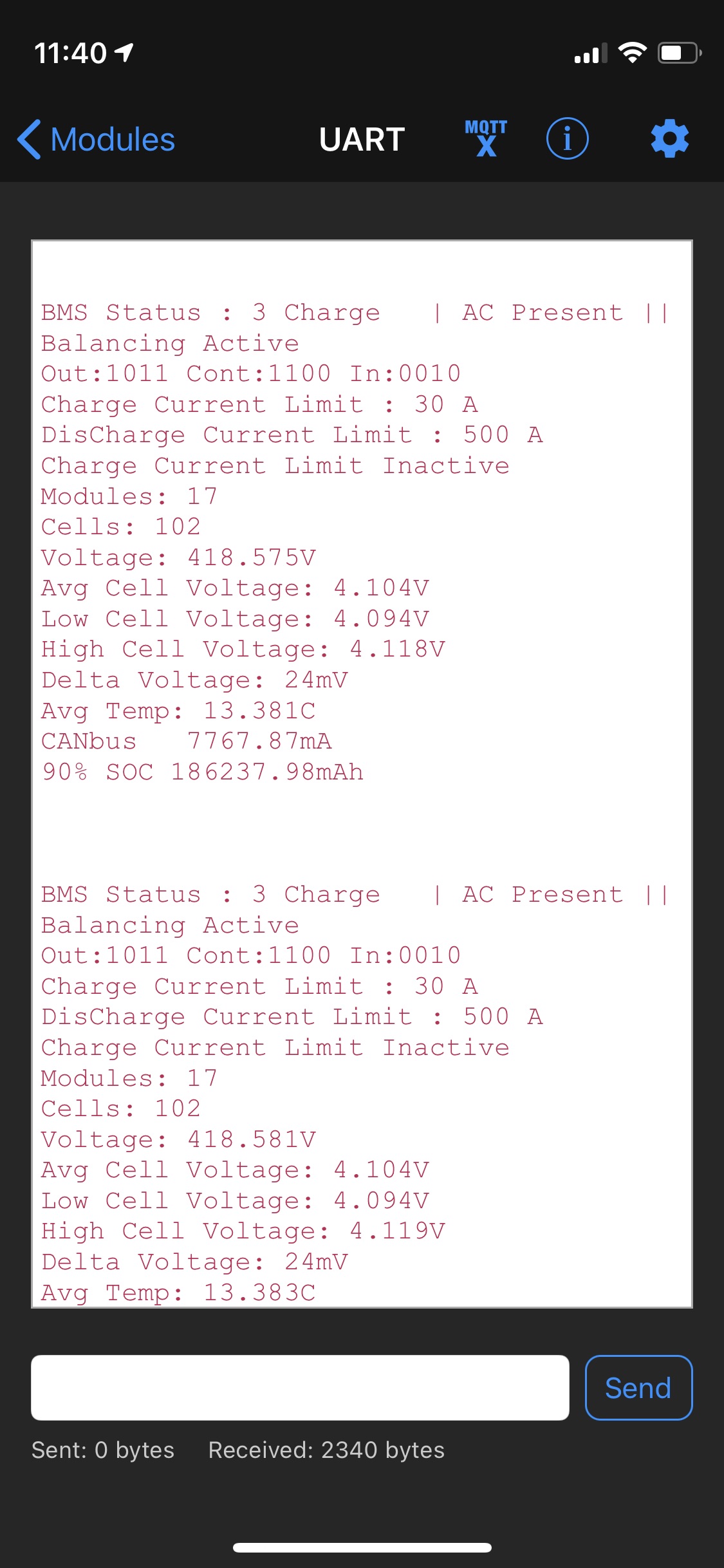 No luck today. Updated the wifi module and have the interface showing. Updated the bootloader and charger file but no parameters coming through on the interface. Need to dig in further tomorrow.
