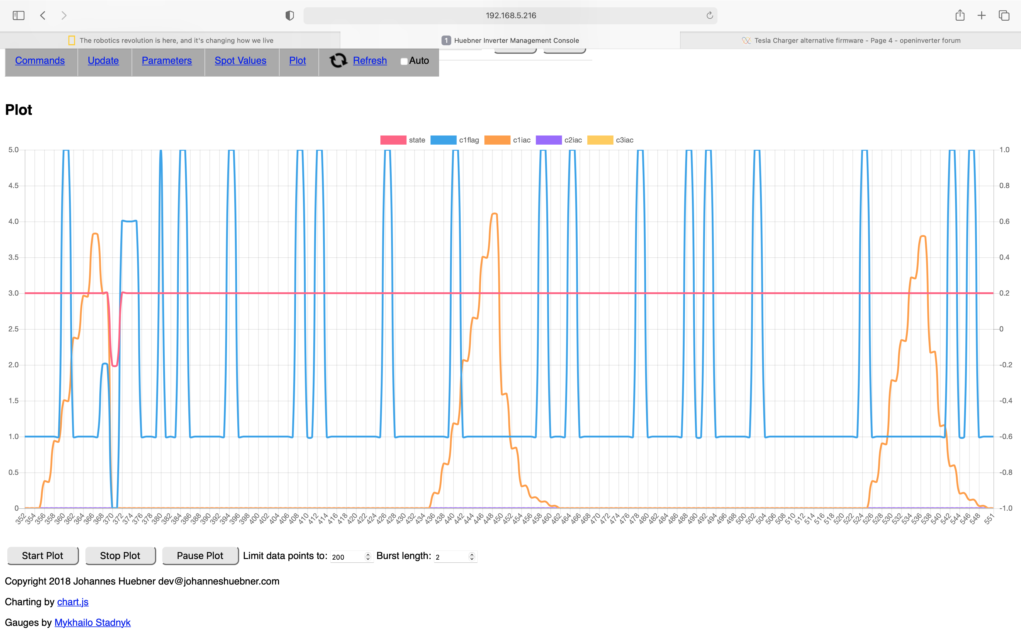 Next plot almost same but charger 3 signals an error, next plot also charger 3. Last plot doesn't show errors, must be outside of plotted range. Only charger that never shows an error is charger 1. Can you try enabling only charger 1? Type "set chargerena 1" into custom command. set chargerena 7 to enable all again.