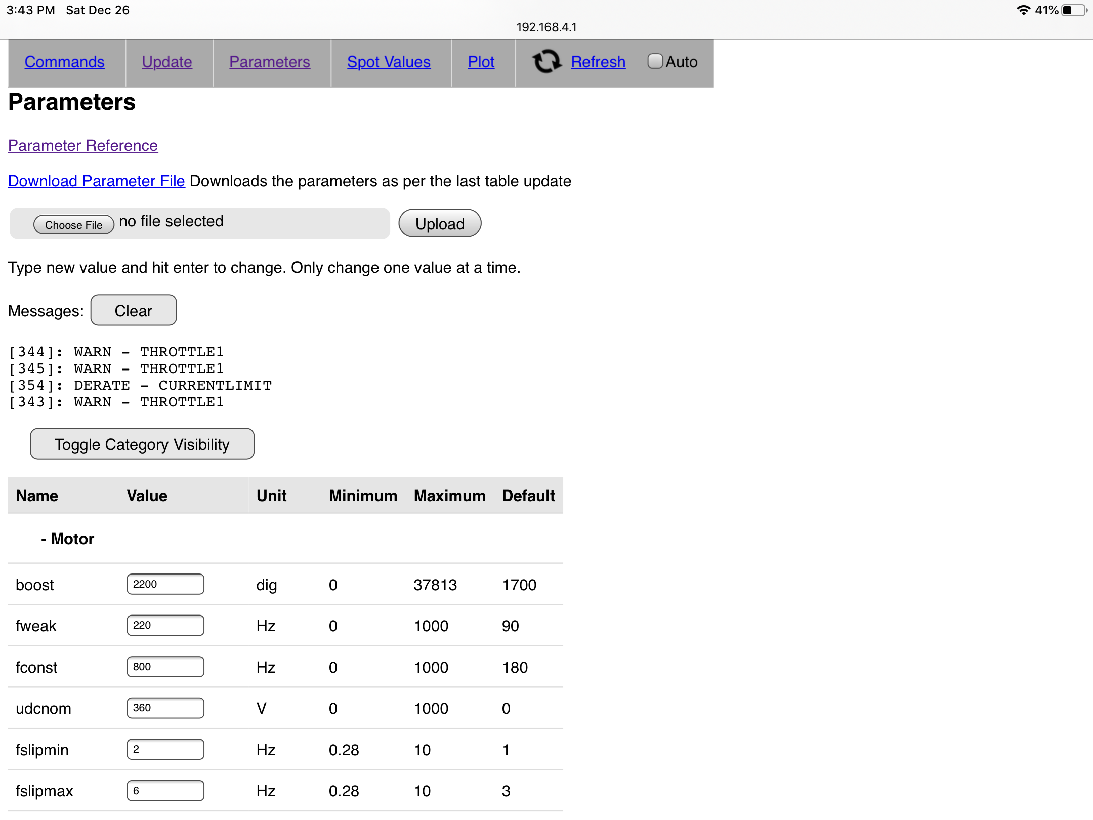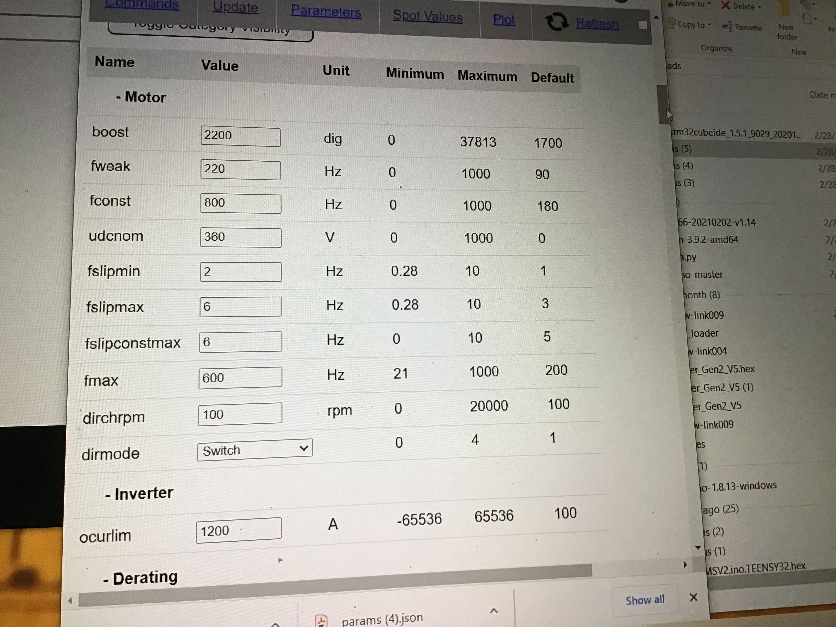 Your parameters look ok but are different from standard. If you want to revert to standard parameters, look here: https://openinverter.org/parameters/view.html?id=15