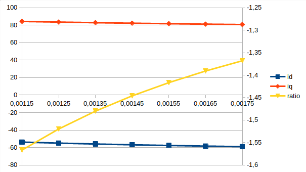 These values plugged into MTPA at 100A total current would result in Id=-57A and Iq=82A. The ratio varies quite a lot with current set points.