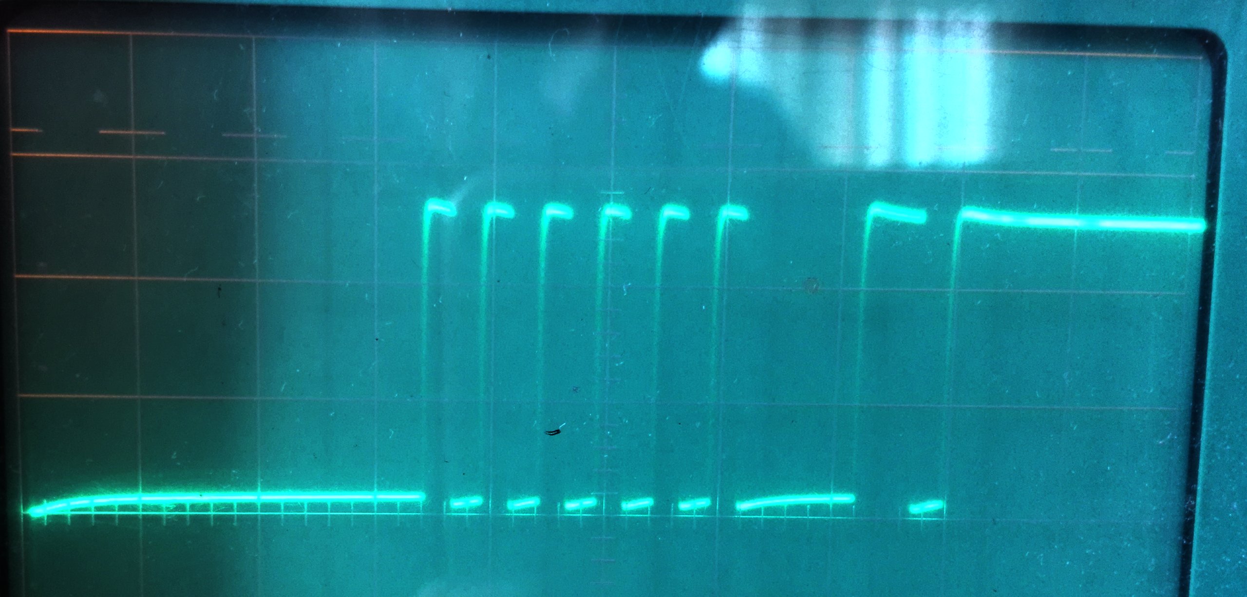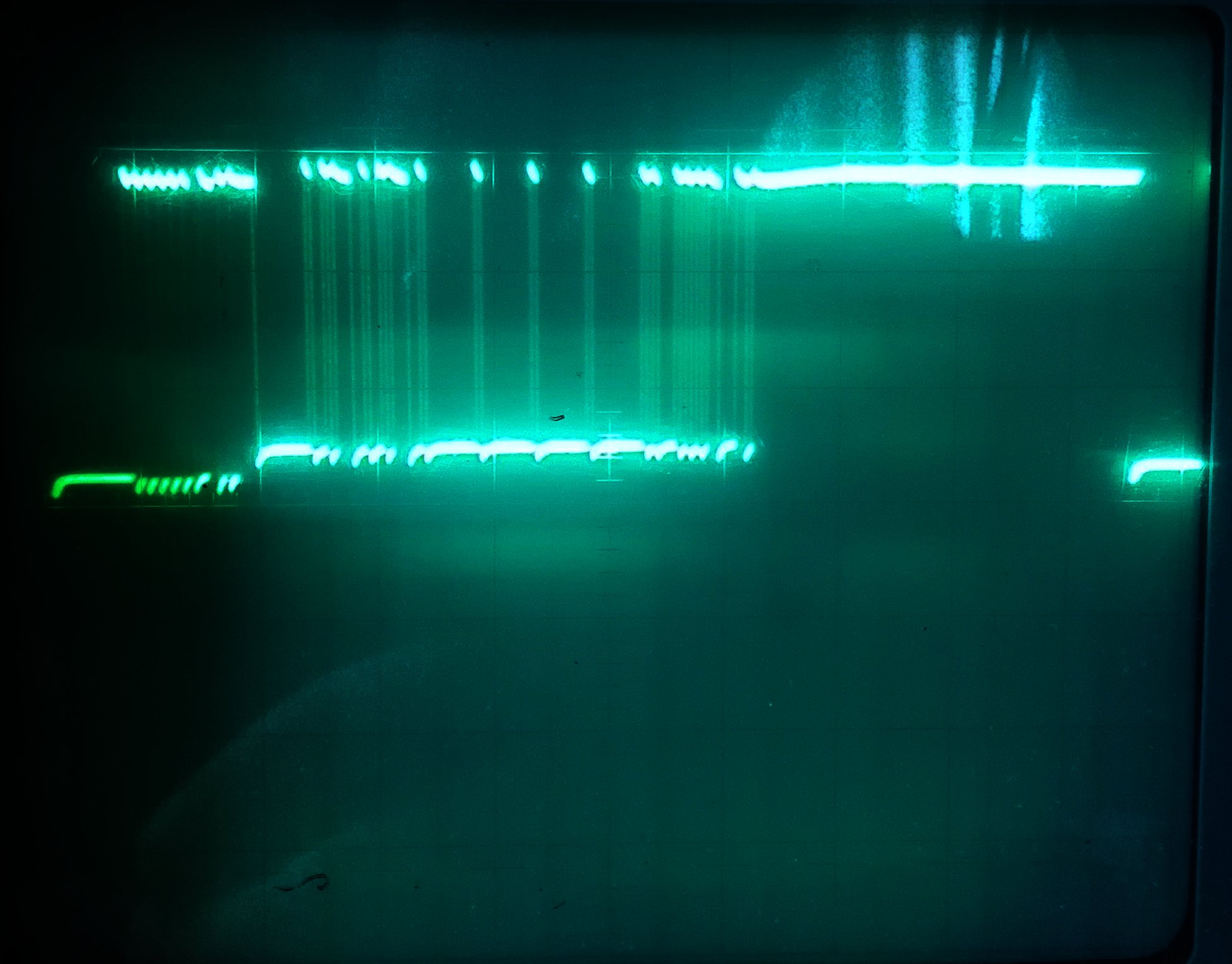 So I'm sending BREAK - SYNC (0x55) - PID (0xD8) - thats what you see on the scope (200us/div). At 19200 baud each bit lasts about 50us.