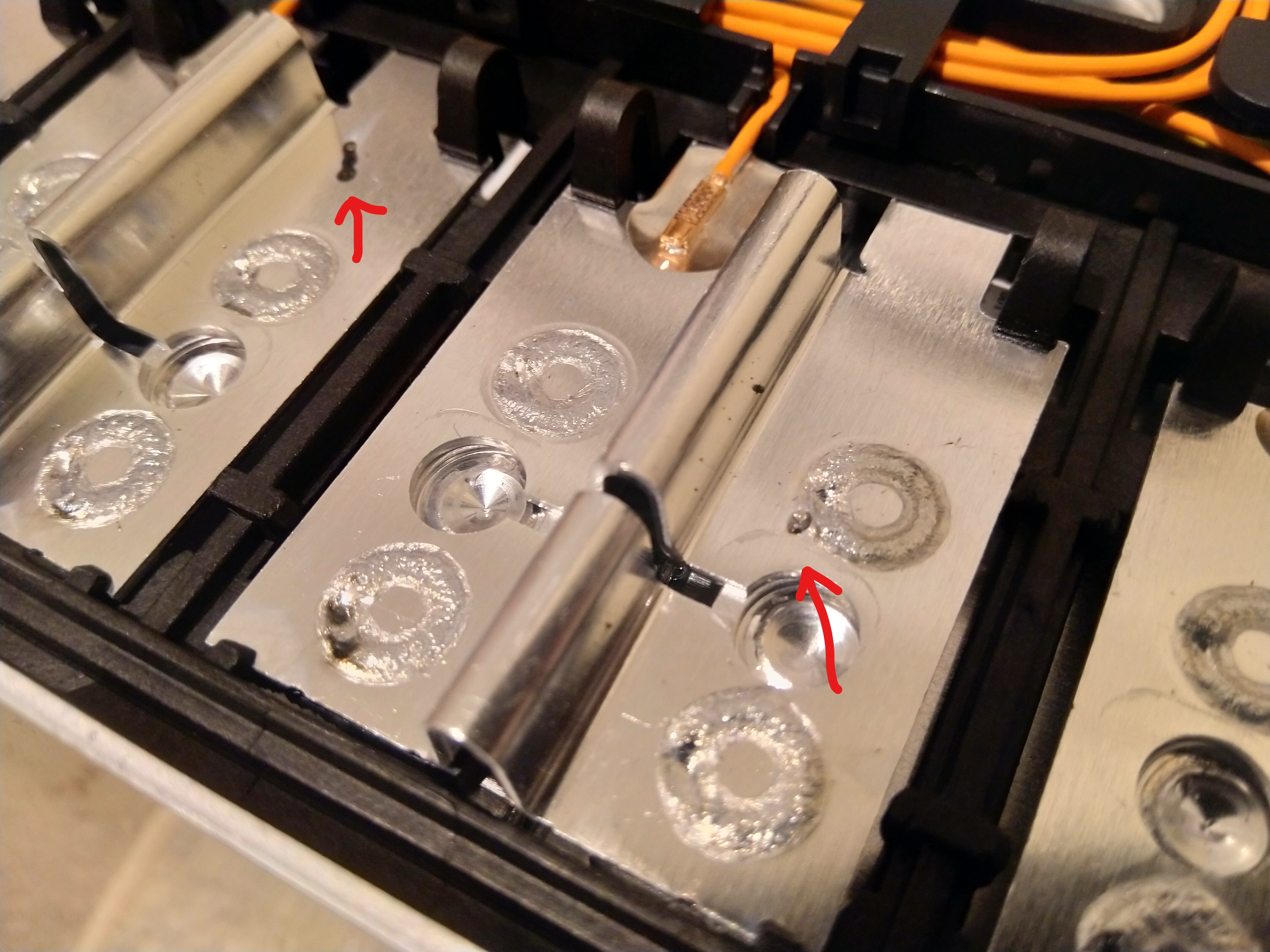 I cant see this ever (even considering the number of cars involved) causing a short between modules. More likely (though still very unlikely) is that spatter from welding the cell connections causes a short between cells. I found the following examples in my pack of six modules, whilst the welds aren't all perfect, the spatter is very tiny and not enough for me to worry about. Obviously there are probably packs out there that are worse, and it doesn't take long to check and remove anything upon receiving a battery. Laser welding is a difficult process to perfect and control so I can empathise with the manufacturer.