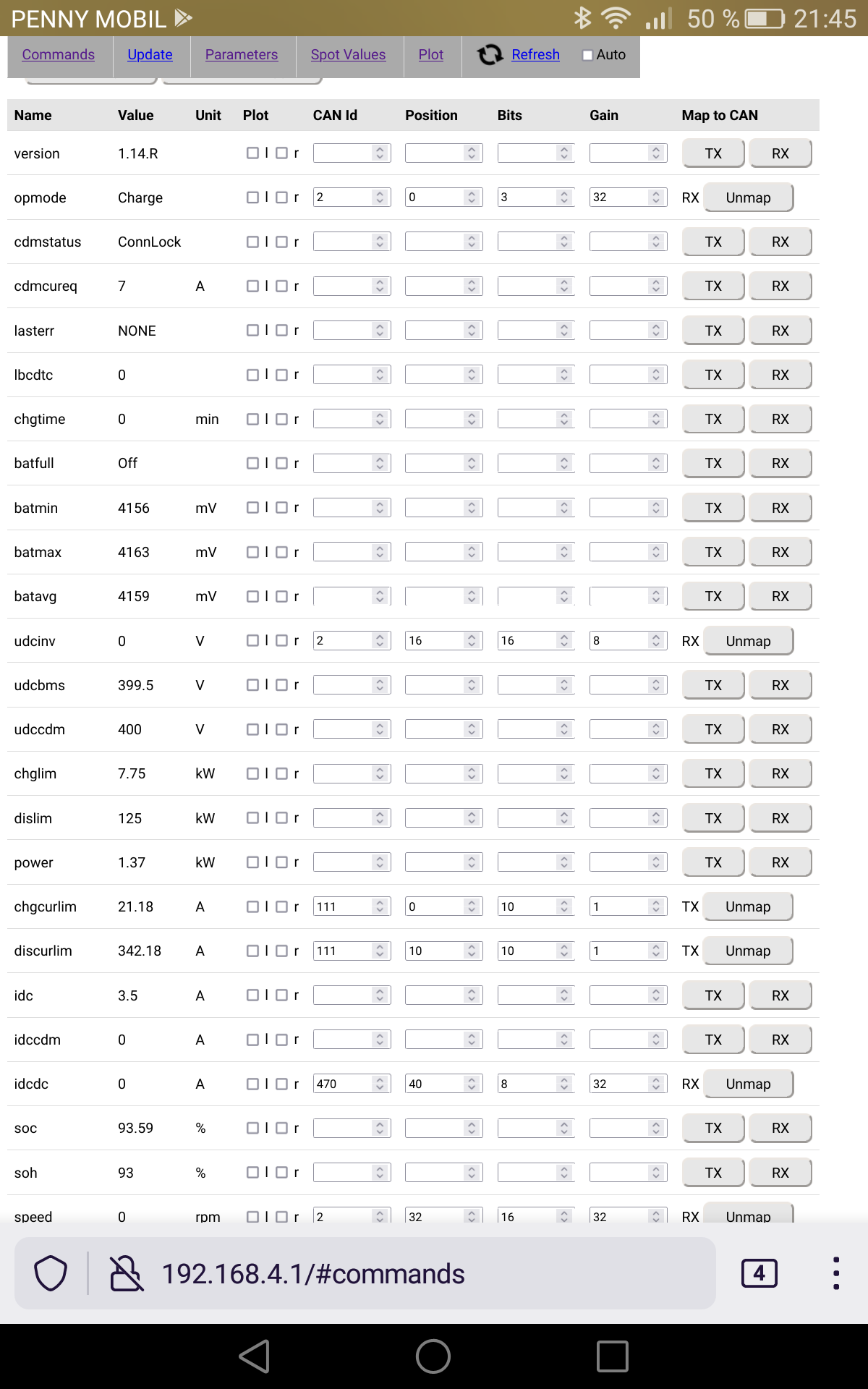 Also found a strange problem with temperature derating. Basically during fast charging the average cell temperature was displayed as 38°C. Then, when I took off it was still 38°C but suddenly jumped to 57°C. This resulted in a power derating to 33 kW. I'm pretty sure this is not representing the actual temperature because it wasn't overheating last summer (35°C outside temp) and also a hot battery pack can be felt through the rear seat carpet. I'm transmitting the outside temperature to the BMS and during charging the sensor is not powered and consequently I report 0°C. Maybe the BMS is then surprised by the sudden jump and does some sort of "correction". Maybe I should just transmit a constant value.