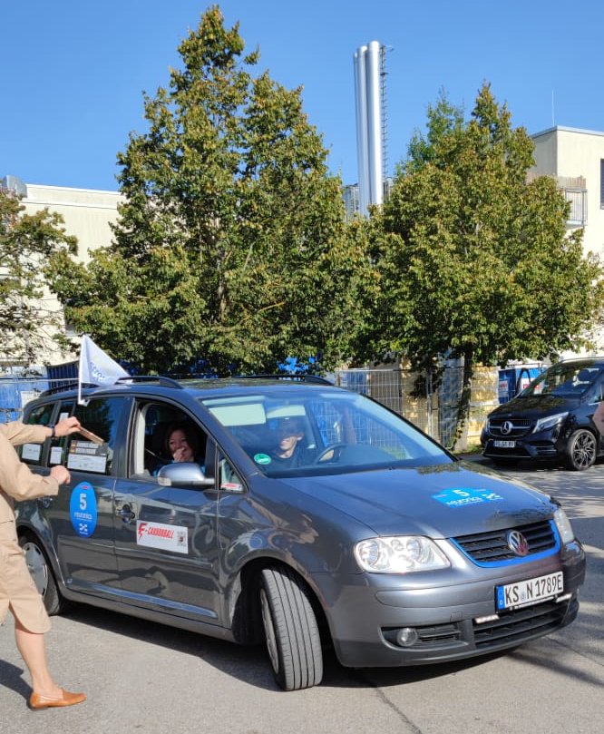 On Friday the car spawned quite some interest at the exhibition. On Saturday we had to get up at 5:30 because we had to drive to the start first and then start at 7. I was super tired and was glad I didn't have to drive the first stint. The trip to Munich was absolutely perfect except driving against head wind all of the time. So consumption was a bit high (169 Wh/km). We charged 5 times but 4 times would have been sufficient. All chargers worked and we always arrived at a free charger and then minutes later cars queued up behind us :)