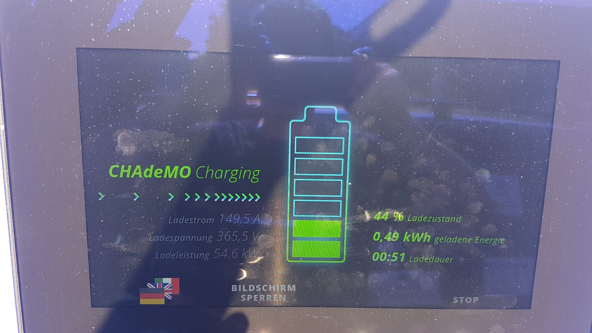 Finally yesterday we drove back home to Kassel which was another 500 km. That time it went semi-good. We actually met Mathieu with his Mustang at the first charge stop. He was using the full 43 kW AC power of a triple charger and the charger didn't allow us to start a CHAdeMO session in parallel.